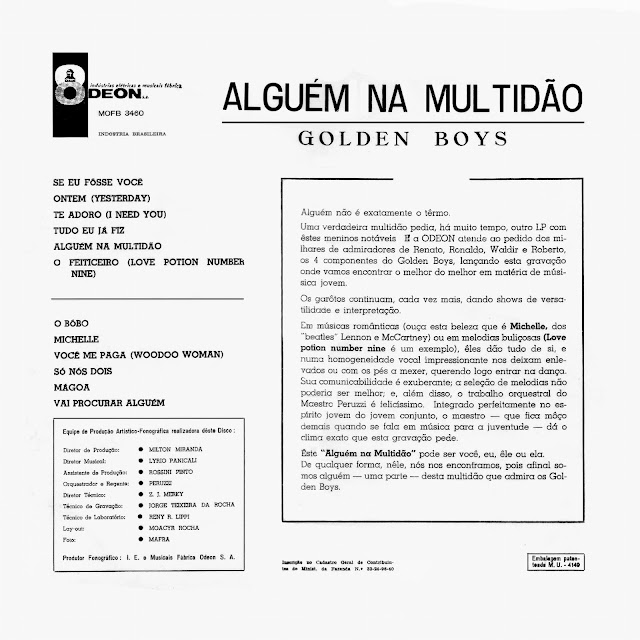 No último sábado, 26 de novembro de 2016, a música popular brasileira sofreu mais uma perda irreparável. Roberto Corrêa, integrante dos Golden Boys, conjunto vocal de grande sucesso na Jovem Guarda, e de longa e vitoriosa trajetória, faleceu aos 76 anos, vítima de um câncer contra o qual lutava há tempos, em seu Rio de Janeiro natal. Formado por três irmãos (Roberto, Ronaldo e Renato Corrêa) e um primo (Waldir da Anunciação, falecido em 2004), o grupo iniciou carreira com seus membros ainda adolescentes (os irmãos mais jovens, Eva, Mário e Regina, formariam depois o Trio Esperança). O primeiro disco dos nossos “garotos de ouro”, em 78 rpm, foi lançado pela Copacabana em setembro de 1958, com as músicas “Wake up, little Susie” (então sucesso da dupla norte-americana Everly Brothers, de autoria do casal Boudleaux e Felice Bryant) e “Meu romance com Laura”, calipso de Jayro Aguiar que logo alcançou sucesso. Apresentaram-se em programas de rádio e televisão sempre com destaque, e gravaram inúmeros discos, entre LPs e compactos. Além disso, no final dos anos 1960 e início dos 70, participaram de vários álbuns de artistas da MPB e do rock brazuca, que futuramente se tornariam cults e objetos de desejo de inúmeros colecionadores, como “Carlos, Erasmo”, de Erasmo Carlos, “A matança do porco”, do Som Imaginário, e também em trabalhos de Marcos Valle. Muitos foram os hits dos Golden Boys, entre eles: “Erva venenosa”, “Ai de mim”, “Toque balanço, moço”, “Pensando nela”, “Andança” (junto com Beth Carvalho), “História em quadrinhos”, “Agora é tarde”, “Fumacê”, “O cabeção”, “Perambulando”, “Minha empregada”, “Sou tricampeão”, “Só vou criar galinha”… Além dos presentes no álbum que comentaremos a seguir. Como compositores, Ronaldo, Roberto e Renato fizeram várias músicas de sucesso. Basta citar, por exemplo, “É papo firme”, de Renato Corrêa e Donaldson Gonçalves, êxito em 1966 na voz do “rei” Roberto Carlos. Ou ainda “Foi assim’ (“Eu vi você passar por mim”…), de autoria de Renato e Ronaldo, marcante sucesso de Wanderléa em 1967. Ela também gravou, do agora falecido Roberto, “Eu já nem sei” e “Te amo”, outros de seus hits. Em homenagem póstuma a Roberto Corrêa, o Toque Musical oferece hoje, a seus amigos cultos, ocultos e associados, um dos melhores álbuns dos Golden Boys, e sem dúvida um título essencial quando se fala em Jovem Guarda. É o antológico “Alguém na multidão”, que a Odeon lançou em plena fervura do movimento, em junho de 1966. Devidamente acompanhados pelos Fevers, e com arranjos do maestro Peruzzi, nossos “garotos de ouro” dão verdadeiros shows de interpretação em suas doze faixas. Muitas delas foram sucessos inesquecíveis, a começar pela faixa-título, de autoria de Rossini Pinto, lançada pela primeira vez em compacto simples, em novembro de 1965, e que se tornaria um dos carros-chefes dos Golden Boys para sempre. As versões “Ontem (Yesterday)”, “Michelle” e “Mágoa (Heartaches)”, são outros pontos altos deste disco, todo excelente e para ser ouvido (e até dançado!) de fio a pavio. Oferecendo esta autêntica obra-prima da Jovem Guarda, um clássico em todos os sentidos, o TM homenageia com justiça o agora saudoso Roberto Corrêa e, por tabela, os Golden Boys, reconhecendo a importância que o grupo teve na história de nossa música jovem e, por extensão, da própria MPB.