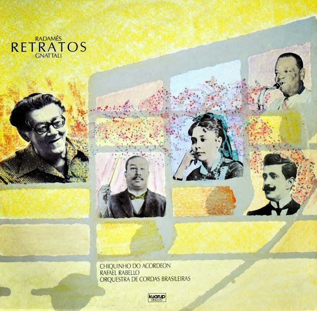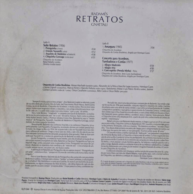 Realmente, eu postei aqui há pouco tempo atrás um álbum promocional da Atlantic, “Radamés e a Música Popular”. Olhando assim por alto, parece ser o mesmo. Inclusive interpretado pelos mesmos mestres, Rafael Rabelo, Chiquinho do Acordeon, Dinho Sete Cordas e Orquestra de Cordas Brasileira. Mas apenas “Concerto para Acordeon, Tumbadoras e Cordas” é parte também do outro disco. O lado A temos a “Suite Retratos”, uma composição que Radamés fez em 1956 para Jacob do Bandolim. Uma composição multifacetada onde o compositor passeia por Pixinguinha, Ernesto Nazareth, Anacleto de Medeiros e Chiquinha Gonzaga. Creio que este disco seja uma outra parte do que já vimos anteriormente. Confiram aí, porque eu daqui vou é tomar um banho e dormir. Té manhã!