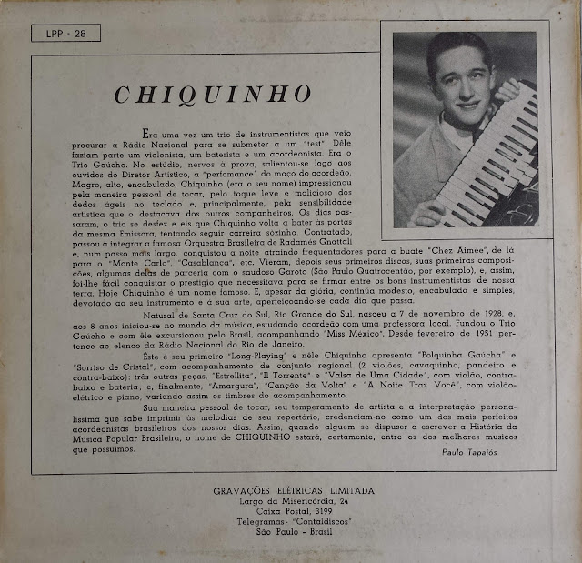 Olá amiguíssimos cultos e o ocultos! Olha só como andam as nossas postagens nesta semana. Ainda vamos de dez polegadas, aproveitando a onda… E nessa levada eu trago agora uma beleza de disquinho, coisa fina e rara. Temos aqui o primeiro lp do gaúcho Romeo Seibel, ou mais conhecido como Chiquinho do Acordeon. Este disco foi lançado nos anos 50 e ao contrário de outros lps de 10 polegadas da época, não se trata de copilação de gravações em 78 rpm. Chiquinho do Acordeon vem acompanhado por um conjunto (regional). Trata-se de um disco de carreira. O que dá ao lp uma maior autenticidade. Curiosamente, não consta em discografias de muitos sites especializados. Daí, vale mesmo a pena ouvir este disco 🙂