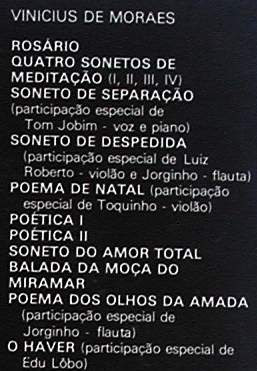 10 – Vinicius Poeta do Encontro (Otto Lara Resende) Texto – Vinicius de Moraes / Suzana de Morais / Paulo Autran – Se Todos Fossem Iguais a Você (Tom Jobim / Vinicius de Moraes)