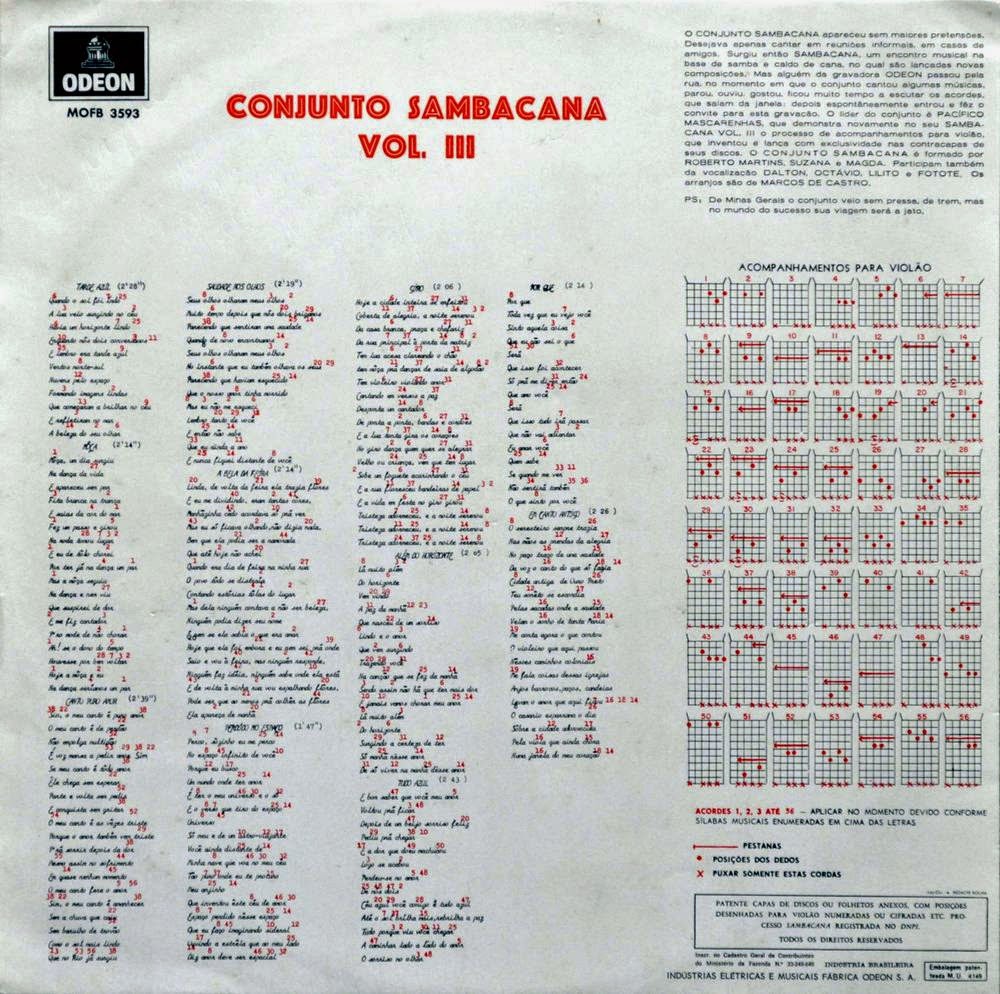 Hoje eu trago para vocês um disco literalmente bacana, o volume 3 do Conjunto Sambacana, criado por Pacífico Mascarenhas, o pioneiro da Bossa Nova em Minas Gerais ainda na primeira metade da década de 60. Eu já havia postado aqui os outros dois primeiros volumes e também o quarto, já dos anos 70. Faltava então o terceiro volume, que é tão bom quanto os demais e da mesma forma um disco raro, peça de colecionador. Neste álbum, lançado pela Odeon em 1969 vamos encontrar um repertório delicioso, com músicas de Pacífico e também outros autores, entre os mais conhecidos, a dupla Antônio Adolfo e Tibério Gaspar, Tito Madi e, inclusive, o Bob Tostes, que só agora eu me dei conta de que é aquele que aparece na capa, em primeiro plano, cantando ao lado de duas outras cantoras. Confiram longo, porque como eu disse, este é um conjunto bacana 😉