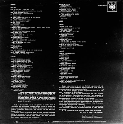 A CBS teve a louvável iniciativa de criar e lançar este disco que é um verdadeiro registro da história da música popular brasileira. A gravadora transformou seu principal estúdio em palco, criando uma apresentação especial para um seleto grupo de pessoas, que puderam assistir Silvio cantando e contando histórias e estórias. Ele narra episódios e fatos da música brasileira, do norte ao sul do Brasil de uma forma muito carinhosa e descontraida, nos revelando acontecimentos interessantes e curiosos. Acompanhado pelo maravilhoso Regional de Canhoto, seu depoimento fica ainda mais musical. Ouvindo a fala deste grande artista percebemos com certeza que ele foi além de tudo um homem bom. Isso é bacana 🙂 Salve Silvio Caldas!