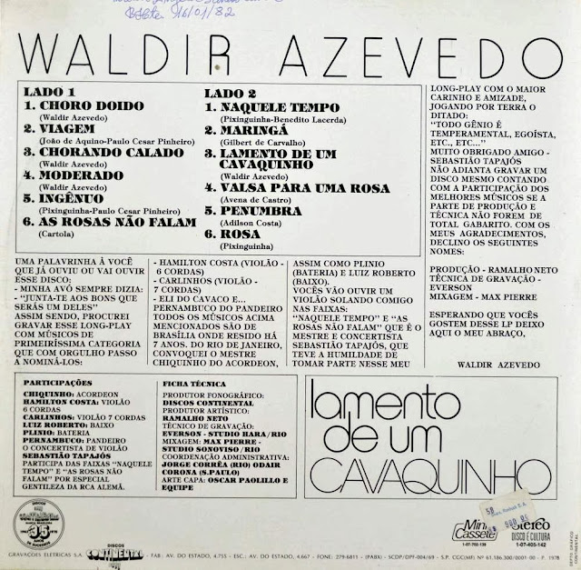 Temos aqui o grande Waldir Azevedo em um dos seus últimos álbum (se não for o último). Lançado em 1978 pelo selo Continental, “Lamento de um cavaquinho” é, sem dúvida, um excelente disco. Um trabalho feito com zelo, produzido por Ramalho Neto, traz Waldir Azevedo muito a vontade ao lado de outras feras da música instrumental brasileira. Figuras como Chiquinho do Acordeon, Pernambuco do Pandeiro, Sebastião Tapajós e outros bambas, fazem desse um dos melhores discos de Waldir. No repertório temos uma série de clássicos da mpb, interpretados com maestria por esses músicos classe A, que fazem deste um lp nota 10!
