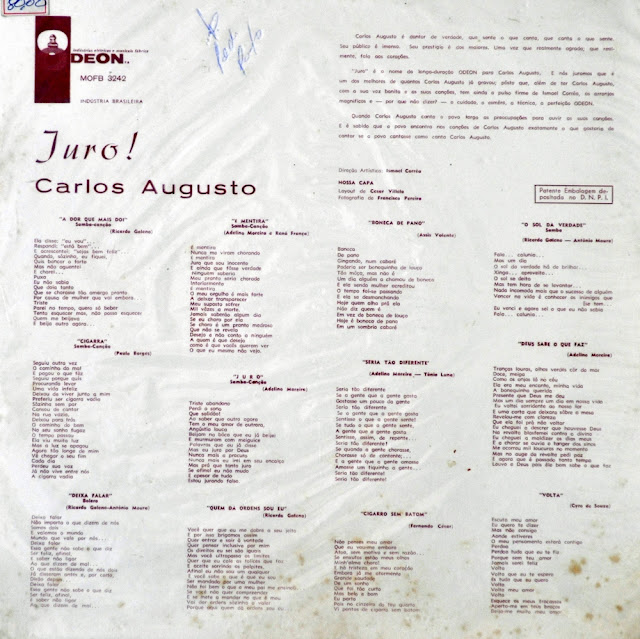 Boa noite, amigos cultos e ocultos! Para manter diária a nossa produção, as vezes somos obrigados a recorrer aos ‘arquivos de gaveta’, ou ainda os arquivos enviados por amigos. Para fechar nosso domingão vamos com uma coletânea da Odeon, trazendo o melhor do seu ‘cast’ em 1961 no lp “Sucessão de Sucessos”. Um disco, que como já se pode ver pela capa tem Dalva de Andrade, Elza Soares, Celly Campello, Jayme Ferreira, Trio Irakitan, Anisio Siilva, Hebe Camargo, Orlando Dias, Isaura Garcia e Carlos Augusto. Infelizmente, as letras das músicas que, num raro momento, foram impressas na contracapa estão em baixa qualidade e quase não se pode ler. Fico devendo, logo que achar o disco, refaço o link. Por hora, ficamos aqui. Valeu, meu caro Denys!