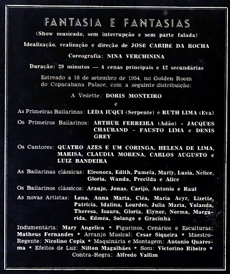 Em homenagem à nossa terça-feira, dia oficial do Carnaval, estou trazendo uma raridade que cabe bem para a ocasião. Um álbum para fechar com chave de ouro a nossa mostra carnavalesca. Mas não pensem vocês que se trata de mais um disco de 10 polegadas feitos para celebrar a festa de um determinado ano. O que temos aqui é a trilha sonora de um espetáculo audacioso apresentado no Golden Room do Copacabana Palace em 1954, chamado “Fantasia e Fantasias”. Criado e dirigido por José Caribé da Rocha, o ‘show musicado, sem interrupção e sem parte falada’ foi uma produção envolvendo música erudita, dança clássica e popular, samba, carnaval e artistas dos mais diversos. Um elenco de bailarinos, cantores e instrumentistas. A coreografia era de Nina Verchinina. Participavam em cena e como cantores, Doris Monteiro, Helena de Lima, Marisa, Claudia Morena, Carlos Augusto, Luiz Bandeira e o conjunto Quatro Azes & Um Coringa. O espetáculo deve ter sido realmente muito interessante. Na contra capa há um texto descrevendo toda a ação. A peça se divide em dois momentos. Inicialmente temos coisas de Liszt, Rachmaninoff e Kachaturian, abrindo os primeiros minutos do disco. Em seguida, ainda no primeiro lado, o ‘pot-pourri’ envereda para o popular, para o samba e as marchinhas de carnaval.