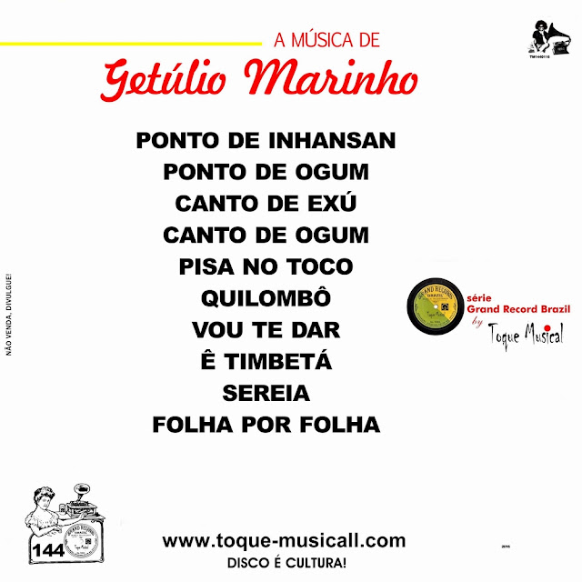 Iniciando com o pé direito o ano de 2016, o Grand Record Brazil apresenta a primeira de duas partes de uma retrospectiva dedicada a um dos mais expressivos compositores de nossa música popular, também instrumentista e dançarino: Getúlio “Amor” Marinho. Nosso focalizado nasceu em Salvador, Bahia, no dia 15 de novembro de 1889, o mesmo da Proclamação da República, recebendo na pia batismal o nome de Getúlio Marinho da Silva. Filho de Paulina Tereza de Jesus e Antônio Marinho da Silva, o “Marinho que Toca”, mudou-se para o Rio de Janeiro aos seis anos de idade, junto com a família, é claro. Com a mesma idade, ingressou no Rancho Dois de Ouro. Foi criado frequentando as casas de tias baianas como Gracinda, Bebiana, Calu Boneca e a lendária Ciata. Participou dos primeiros ranchos carnavalescos cariocas criados por baianos, então residentes no bairro da Saúde. Getúlio saía como porta-machado no Dois de Ouros, e ainda desfilava no Concha de Ouro. Frequentou as rodas de samba organizadas por baianos que se reuniam no Café Paraíso, então situado à Rua Larga de São Joaquim, atual Avenida Marechal Floriano. Mestre-sala de inúmeros ranchos carnavalescos (Flor do Abacate, Quem Fala de Nós Tem Paixão, Reinado de Silva), aprendeu a coreografia com o pioneiro Hilário Jovino Ferreira, tornando-se grande especialista nessa arte. Estava sempre vestido de forma impecável, com roupas de fidalgo, sapatos de fivela e salto alto, de luvas e cabeleira empoada, como se fosse alguém vindo das cortes francesas. Sua coreografia era sóbria, sem acrobacias nem presepadas, e exatamente por sua finesse, recebia os aplausos do público presente aos desfiles. Em 1916, iniciou sua carreira artística, atuando como dançarino na revista “Dança de velho”, encenada no Teatro São José. Sua primeira composição gravada foi o samba “Não quero amor”, em 1930, pelo Conjunto Africano. Frequentou terreiros de macumba e conheceu pais de santo afamados, como João Alabá, Assumano e Abedé, recolhendo pontos do gênero e levando-os ao disco, juntamente com Elói Antero Dias, o Mano Elói. Outros pontos de macumba por ele compostos foram gravados por Moreira da Silva. De 1940 a 1946, Getúlio foi o “cidadão-samba” do carnaval carioca. Entre suas composições de maior sucesso, destacam-se o samba “Apanhando papel” e a marchinha junina “Pula a fogueira”. Era também considerado grande tocador de omelê, antigo nome da cuíca. Em 1963, já quase esquecido, adoeceu seriamente, e foi internado no Hospital dos Servidores da então Guanabara, vindo a falecer a 31 de janeiro do ano seguinte, 1964. Nesta primeira parte da retrospectiva que o GRB dedica a Getúlio “Amor” Marinho, apresentamos oito de seus pontos de macumba, um jongo e um samba, perfazendo um total de dez fonogramas históricos e importantes. Começamos com o “Ponto de Inhansan” (ou Iansã), que ele gravou com seu Conjunto Africano na Odeon em 9 de março de 1937, com lançamento em junho do mesmo ano, disco 11481-A, matriz 5533. Logo em seguida temos o lado B, “Ponto de Ogum”, matriz 5534, regravação de música que já lançara em 1930, em dueto com Mano Elói. Foi lançada justamente nesse ano, mais precisamente em outubro de 30, nossa faixa seguinte, o “Canto de Exú”, de domínio público, igualmente pelo Conjunto Africano, disco Odeon 10690-A, matriz 3879. Depois temos o lado B desse disco, “Canto de Ogum”, outro motivo popular, matriz 3880. Apresentamos em seguida as músicas do único disco de João Quilombô, o Parlophon 13400, lançado por volta de abril de 1932, justamente dois pontos de macumba de “Amor”: “Pisa no toco”, matriz 131362, e “Quilombô”, matriz 131363. “Vou te dar”, samba do carnaval de 1933, é uma parceria de “Amor” com Alcebíades “Bide” Barcellos, e foi lançado pela Odeon em janeiro desse ano, na voz de Luiz Barbosa, disco 10971-B, matriz 4586. O jongo “Ê timbetá”, de “Amor” sem parceiro, foi gravado na Victor por J. B. de Carvalho, acompanhado de seu Conjunto Tupi, em 27 de maio de 1936, com lançamento em julho do mesmo ano, disco 34075-B, matriz 80168. Encerrando esta primeira parte, dois pontos de macumba que “Amor” compôs com João da Baiana, interpretados pelo parceiro com seu conjunto, em gravações Victor de 21 de março de 1938, lançadas em maio seguinte no disco 34313. No lado A, matriz 80707, “Sereia”, e no B, matriz 80708, “Folha por folha”. Na próxima edição do GRB, mais um pouco da obra musical de Getúlio “Amor” Marinho. Até lá!
