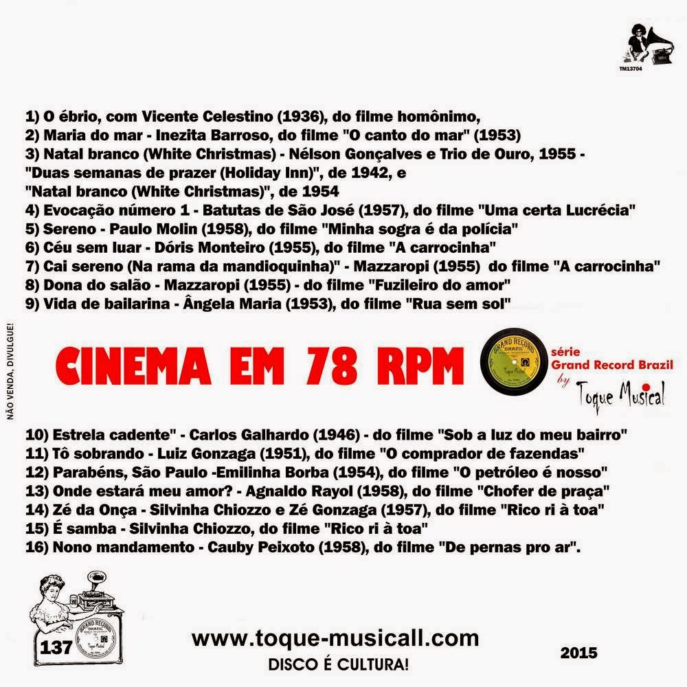 Estamos de volta com o Grand Record Brazil, agora em sua edição de número 137. E a seleção musical desta quinzena foi preparada por uma pessoa muito especial: eu próprio! Tudo começou quando o Augusto me mandou diversos áudios extraídos de clipes produzidos para o YouTube, pela Rádio Educativa Mensagem de Santos, aproveitando cenas de filmes diversos, todos em preto e branco. No entanto, apenas quatro músicas, devidamente conservadas aqui , fizeram realmente parte de filmes. Então sugeri que fosse feita uma edição com músicas que foram realmente apresentadas em películas de sucesso, a maior parte nacionais. Com o devido acolhimento da ideia, e com carta branca para sua elaboração, consegui garimpar dezesseis fonogramas, alguns até raríssimos, extraídos das bolachas de cera velhas de guerra. Uma seleção que resultou inclusive de pesquisas em fontes diversas, particularmente o “Dicionário de filmes brasileiros – longa-metragem”, de Antônio Leão da Silva Neto (Editora Futuro Mundo, 2002). Isto posto,vamos às músicas.Para começar, temos o clássico “O ébrio”, canção de e com Vicente Celestino, “a voz orgulho do Brasil”, por ele gravada na Victor em 7 de agosto de 1936 e lançada em setembro do mesmo ano, disco 34091-A, matriz 80195. O filme viria dez anos depois, produzido pela Cinédia e dirigido pela esposa do cantor, Gilda de Abreu, com grande bilheteria (teria superado até mesmo “Tropa de elite2”, o recordista oficial de bilheteria do cinema brazuca). Esta gravação é uma montagem que apresenta, primeiramente, o monólogo inicial, extraído da regravação que Celestino fez da música em 1957, e, em seguida, o registro original de 1936, junção esta feita para a coletânea “Sessenta anos de canção”, lançada após a morte do cantor, em 1968. Inezita Barroso, recentemente falecida, aqui comparece com “Maria do mar”, canção do maestro Guerra Peixe em parceria com o escritor José Mauro de Vasconcelos, autor de romances de sucesso como “Vazante”, “Coração de vidro”, “Banana brava” e “O meu pé de laranja-lima”. Fez parte do filme “O canto do mar”, produção da Kino Filmes dirigida por Alberto Cavalcanti, e Inezita a gravou na RCA Victor em 4 de agosto de 1953,com lançamento em outubro do mesmo ano, disco 80-1209-B, matriz BE3VB-0222. Temos, em seguida, a única composição de origem estrangeira inclusa nesta seleção. Trata-se de “Natal branco (White Christmas)”, fox de autoria de Irving Berlin, um dos maiores compositores dos EUA, e sucesso em todo o mundo. Seu intérprete mais constante foi o ator e cantor Bing Crosby, que a lançou em um show que fez para os pracinhas norte-americanos que serviam nas Filipinas, durante a Segunda Guerra Munidal. Bing também interpretou este clássico em dois filmes: “Duas semanas de prazer (Holiday inn)”, de 1942, e “Natal branco(White Christmas)”, de 1954. Com letra brasileira de Marino Pinto, foi levado a disco na RCA Victor por Nélson Gonçalves, ao lado do Trio de Ouro, então em sua terceira fase (Lourdinha Bittencourt, então esposa deNélson, Herivelto Martins e Raul Sampaio), no dia 25 de novembro de 1955, mas estranhamente só saiu em janeiro de 56, disco 80-1551-B, matriz BE5VB-0926. Houve uma versão anterior, assinada por Haroldo Barbosa, que Francisco Alves interpretava em programas de rádio, porém não gravada comercialmente. Na quarta faixa, o maior sucesso autoral do compositor pernambucano Nélson Ferreira: o frevo-de-bloco “Evocação”, primeiro de uma série de sete com o mesmo título, homenageando grandes nomes do carnaval recifense do passado. A interpretação é do Bloco Batutas de São José,lançada pela recifense Mocambo em janeiro de 1957, no 78 rpm n.o 15142-B, matriz R-791, e no LP coletivo de 10 polegadas “Viva o frevo!”. “Evocação” foi também sucesso no eixo Rio-São Paulo, em ritmo de marchinha, entrando na trilha sonora do filme “Uma certa Lucrécia”, de Fernando de Barros, estrelado por Dercy Gonçalves. Logo depois, outra gravação da Mocambo: é a balada-rock “Sereno”, lançada em 1958 no 78 rpm n.o 15233-A, matriz R-985, e incluída mais tarde no LP “Surpresa”. A música fez parte do filme “Minha sogra é da polícia”, uma comédia dirigida pelo mesmo autor da composição, Aloízio T. de Carvalho, e por sinal bastante cultuada pelos fãs de dois futuros astros da Jovem Guarda, Roberto & Erasmo Carlos, pois marcou a primeiríssima aparição de ambos no cinema. “Sereno” também foi revivida, em 1976, na novela “Estúpido Cupido”, da TV Globo, cuja trilha sonora foi a de maior vendagem da história da gravadora Som Livre: mais de dois milhões e meio de cópias! Na sexta faixa, uma raridade absoluta: trata-se da toada “Céu sem luar”, do maestro Enrico Simonetti em parceria com o apresentador de rádio e televisão Randal Juliano. Quem a interpreta, com suporte orquestral do mestre Tom Jobim, é Dóris Monteiro, em gravação Continental de 6 de maio de 1955, lançada em outubro do mesmo ano, disco 17171-A, matriz C-3628. Dóris também a interpretou no filme “A carrocinha”, produção de Jaime Prades estrelada por Mazzaropi sob a direção de Agostinho Martins Pereira, e na qual Dóris também contracenou com outro mestre, Adoniran Barbosa (seu pai, na trama). Desse mesmo filme, agora com o próprio Mazzaropi, um dos mais queridos comediantes do cinema brazuca, até hoje lembrado com saudade, é nossa sétima faixa, o baião “Cai, sereno (Na rama da mandioquinha)”, baião de Elpídio “Conde” dos Santos (autor do clássico “Você vai gostar”).O eterno jeca registrou “Cai, sereno” na RCA Victor em 2 de agosto de 1955, e o lançamento se deu em outubro do mesmo ano, disco 80-1497-A, matriz BE5VB-0821. Temos também o lado B desse disco,matriz BE5VB-0822, também de Elpídio: a rancheira “Dona do salão”, interpretada por Mazza no filme “Fuzileiro