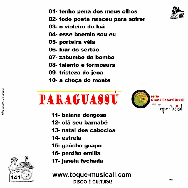 Estamos de volta com o Grand Record Brazil, em sua edição de número 141, apresentando a segunda parte do retrospecto que dedicamos a Paraguassu, “o cantor das noites enluaradas”. São mais dezessete gravações de inestimável valor histórico e artístico que oferecemos aos amigos cultos, ocultos e associados do TM. Abrindo esta seleção, o tango-canção “Tenho pena dos meus olhos”, de Angelino de Oliveira, gravação Columbia de 1931, lançada provavelmente no mês de maio, disco 22016-A, matriz 380982. Em seguida, a bela canção “Todo poeta nasceu para sofrer”, de Mílton Amaral, lançada pela Columbia em fevereiro de 1932, disco 22093-A, matriz 381122. “O violero do luá” (assim mesmo, em caipirês), é outra primorosa canção, do próprio Paraguassu com versos de Assumpção Fleury, e a Columbia a editou em janeiro de 1933, sob número 22183-A, matriz 381408. Ainda de 33 é “Esse boêmio sou eu”, outra canção, esta de Paraguassu sem parceiro, que abre o Columbia 22209, matriz 381409. “Portera véia” (também com título em caipirês) é mais uma canção do próprio Paraguassu sem parceiro, em gravação Columbia de 1934, disco 22255-A, matriz 3003. Em seguida temos o clássico “Luar do sertão”, com versos de Catulo da Paixão Cearense e melodia também a ele creditada, mas que teria sido feita pelo violonista João Pernambuco a partir do tema folclórico nordestino “É do Maitá”. Lançada por Mário Pinheiro em 1914, como “toada sertaneja”, a canção tem várias gravações, e Paraguassu aqui a revive em registro Columbia de 1936, disco 8196-A, matriz 3261. “Zabumbo do bombo” é uma toada de Roberto de Andrade, que ele mesmo canta junto com Paraguassu em outra gravação Columbia de 1936, disco 8208-B, matriz 3315. Em seguida, outra modinha clássica, “Talento e formosura”, com versos de Catulo da Paixão Cearense e melodia de Edmundo Otávio Ferreira, também lançada originalmente por Mário Pinheiro, em 1904. A gravação de Paraguassu abre o disco Columbia 8280, de 1937, matriz 3430. A seguir, um outro clássico: a toada “Tristeza do jeca”, obra máxima de Angelino de Oliveira, verdadeiro hino do caipira paulista. Surgiu em disco pela primeira vez em 1925, na execução da Orquestra Brasil-América, e, um ano depois, Patrício Teixeira a gravou cantada, com sucesso. Merecedora de inúmeras gravações, é interpretada aqui por Paraguassu em registro Columbia de 1937, disco 8287-A, matriz 3431. No verso, matriz 3433, uma regravação da canção “A choça do monte”, outra obra totalmente creditada a Catulo da Paixão Cearense. Foi lançada por Eduardo das Neves em 1913, e Paraguassu já havia feito gravação anterior, pela Odeon, em 1927. Apresentamos em seguida as duas músicas do disco gravado por Paraguassu em dueto com Nhá Zefa (Maria di Léo), considerada a caipira mais preferida de Cornélio Pires, embora fosse paulistana do Brás, onde também nasceu Paraguassu, e, como ele, filha de imigrantes italianos. São duas batucadas que a Columbia editou sob número 8328, por certo visando o carnaval de 1938: “Baiana dengosa”, motivo popular adaptado pelo próprio Paraguassu, matriz 3581, e “Olá, seu Barnabé”, dele mesmo sem parceria, matriz 3582. Da curta passagem de Paraguassu pela Victor é a rancheira “Natal dos caboclos”, dele próprio em parceria com o já mencionado Capitão Furtado (Ariowaldo Pires), com participação vocal do Quarteto Tupã, formado pelo compositor Georges Moran, russo radicado no Brasil, e integrado pelas então jovenzinhas Salomé Cotelli, Consuelo, Hedymar Martins (irmã de Herivelto Martins) e Lourdes, que mais tarde fariam parte de outros grupos mais famosos. Gravação de 26 de setembro de 1938, lançada pela marca do cachorrinho Nipper em dezembro do mesmo ano, disco 34397-B, matriz 80904. É nesse período que, como já informamos, as gravações de Paraguassu ficam cada vez mais espaçadas. Tanto que as duas faixas seguintes são de 1945, na Continental, ambas com acompanhamento do conjunto do violonista Antônio Rago, e gravadas em 12 de julho desse ano. “Perdão, Emília”, outra famosa modinha brasileira, tem versos de José Henriques da Silva (1855-1930), poeta e jornalista português radicado desde menino na cidade de São João da Barra (RJ). Ele os escreveu em 1874, com apenas 19 anos, com o título de “Vingança no cemitério”, sendo musicada depois pelo sanjoanense Juca Pedaço (“Perdão, Emília foi título dado por batismo popular). O registro de Paraguassu, o único feito na fase elétrica de gravação, foi lançado pela Continental em agosto de 1945, sob número 15411-A, matriz 10444. “Estela” é outra modinha clássica, com versos de Adelmar Tavares e melodia de Abdon Lyra. Feito na mesma sessão de “Perdão, Emília”, a 12 de julho de 1945, o registro de Paraguassu foi lançado pela Continental em setembro do mesmo ano sob número 15419-A, matriz 10445. A moda campeira “Gaúcho guapo”, do próprio Paraguassu, foi por ele gravada na mesma Continental em 16 de abril de 1948, matriz 10849, mas o disco só saiu em março-abril de 49, sob número 16064-A. Por fim, apresentamos “Janela fechada”, valsa-canção do próprio Paraguassu, lado B de seu derradeiro disco 78, o Chantecler 78-0303-B, lançado em agosto de 1960, matriz C8P-606. Enfim, é a homenagem do GRB ao notável e legendário Paraguassu, que através de seu canto resgatou inúmeras páginas musicais genuinamente nossas e lançou outras tantas, e deve ser sempre enaltecido pela contribuição preciosa que deixou para a MPB.