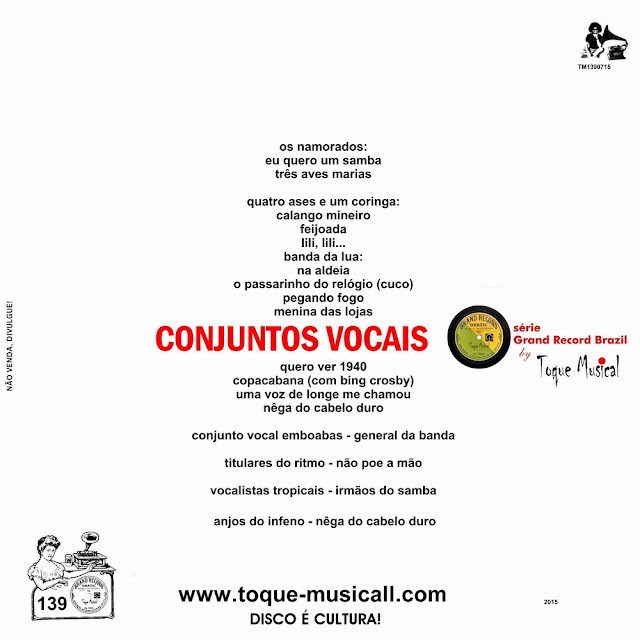 E aí vai, para os amigos cultos, ocultos e associados do TM, a edição de número 139 do Grand Record Brasil. Desta feita, apresentamos gravações de conjuntos vocais e instrumentais que marcaram época na história de nossa música popular, perfazendo um total de dezessete faixas.