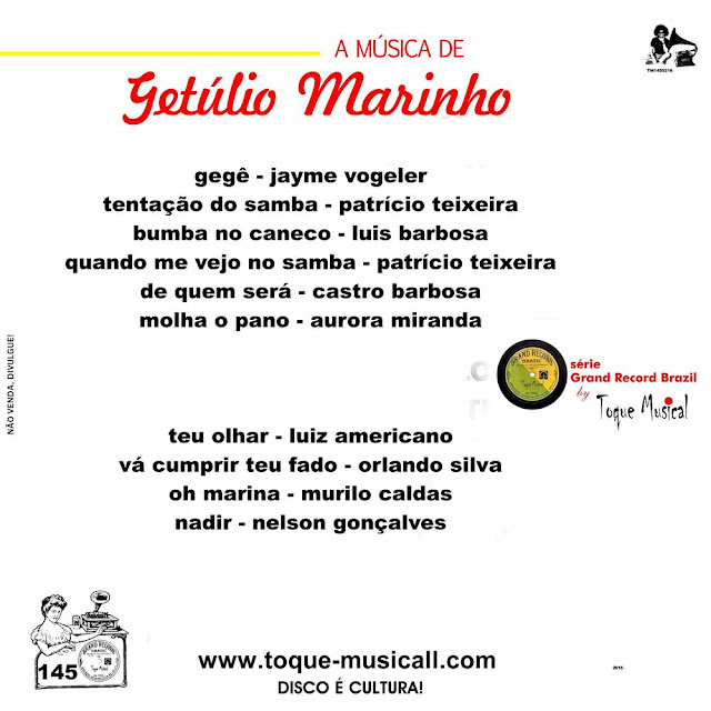 O Grand Record Brazil oferece hoje, mui prazeirosamente, aos amigos cultos, ocultos e associados do TM, a segunda parte da retrospectiva dedicada a Getúlio “Amor” Marinho, compositor carioca intimamente ligado ao carnaval e ás escolas de samba, oferecendo mais dez preciosas gravações de obras suas. Para começar, a marcha-rancho “Gegê”, parceria de “Amor” com Eduardo Souto (compositor de belas páginas desse gênero), do carnaval de 1932. A gravação ficou por conta de Jayme Vogeler, na Odeon, acompanhado pela Orquestra Copacabana de Simon Bountman, em 24 de novembro de 31, disco 10876-A, matriz 4369. É a crônica musical de um episódio segundo o qual o então presidente Getúlio Vargas, assim que tomou posse, em 1930, começou a receber inúmeros pedidos de empregos públicos, e, para protelar e desacelerar essa avalanche (era um período de crise financeira, como agora), passou a exigir requerimento estampilhado, com foto e selos. Só que “Gegê”, aqui, não é o apelido de Getúlio, e sim um nome qualquer, ou seja, apenas uma coincidência. A música, por sinal, até venceu um concurso promovido pelo “Correio da Manhã”, através de votos impressos no próprio jornal, apontando a melhor música da folia momesca de 1932, deixando em segundo lugar o clássico “Teu cabelo não nega”, dos irmãos Valença e Lamartine Babo. Logo depois, o partido-alto “Tentação do samba”, que “Amor” fez com seu mais constante parceiro, João Bastos Filho. Foi gravado por Patrício Teixeira na Victor em 2 de fevereiro de 1933, com lançamento em março do mesmo ano, disco 33633-A, matriz 65660. Luiz Barbosa, sambista prematuramente desaparecido, mas cujo estilo deixou inúmeros seguidores , aqui comparece com a batucada “Bumba no caneco”, parceria de Getúlio “Amor” Marinho com Orlando Vieira. Destinada ao carnaval de 1933, foi gravada na Odeon em 24 de janeiro desse ano, com lançamento a toque de caixa sob número de disco 10974-A, matriz 4594. Patrício Teixeira retorna em seguida para interpretar “Quando me vejo num samba”, de “Amor” sem parceiro, gravação Victor de 17 de maio de 1933, somente lançada em setembro de 34 (!), disco 33818-B, matriz 65735. Castro Barbosa vem depois com “De que será?”, marchinha do carnaval de 1935, da parceria “Amor”-João Bastos Filho. Acompanhado pelos Diabos do Céu, de Pixinguinha, Barbosa gravou a música na Victor em 4 de dezembro de 34, com lançamento bem em cima da folia, em fevereiro, disco 33899-A, matriz 79795. Aurora Miranda, irmã de Cármen, comparece aqui com o samba “Molha o pano”, de “Amor” e Vasconcelos, do carnava de 1936. Gravação Odeon de 16 de dezembro de 35, lançada um mês antes da folia, em janeiro, disco 11320-A, matriz 5213. Ainda de “Amor” e João Bastos Filho é a valsa “Teu olhar”, executada por Luiz Americano à clarineta com a maestria habitual, em gravação Odeon de 3 de outubro de 1936, lançada em abril de 37, disco 11459-B, matriz 5390. Ídolo popular inesquecível, Orlando Silva aqui apresenta o samba “Vai cumprir o teu fado”, da parceria Getúlio “Amor” Marinho-João Bastos Filho, sucesso do carnaval de 1940. Gravação Victor de 26 de setembro de 39, lançada ainda em novembro, disco 34517-B, matriz 33165. Dessa parceria é também a marchinha “Oh! Mariana”, da mesma folia momesca, interpretada pelo irmão de Sílvio Caldas, Murilo. Gravação Victor de 22 de novembro de 1939, lançada em janeiro de 40, disco 34561-B, matriz 33286. Por fim, o grande Nélson Gonçalves, interpretando, também de “Amor” e João Bastos Filho, a valsa “Nadir”, gravação Victor de 30 de maio de 1944, lançada em agosto do memso ano, disco 80-0198-A, matriz S-052968. Um belo fecho para esta seleção que o GRB dedica a Getúlio “Amor” Marinho, com toda a certeza. Até a próxima!