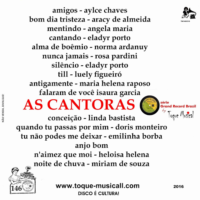 Para alegria de nossos amigos cultos e ocultos, o Grand Record Brazil, “braço de cera” do Toque Musical, reunindo gravações em 78 rpm, está de volta. Neste volume, que é o de número 150, apresentamos composições do mestre Antônio Carlos Jobim, aliás Tom Jobim (Rio de Janeiro, 25/1/1927-Nova York, EUA, 8/12/1994), todas de sua fase pré-bossanovista, interpretadas por grandes cantoras da década de 1950. Abrindo este volume, Ângela Maria, então no auge da carreira, interpreta, acompanhada por Betinho e seu conjunto, a toada “A chuva caiu”, parceria de Jobim com o violonista Luiz Bonfá. Um grande sucesso lançado pela Copacabana em abril de 1956, em disco número 5540-A, matriz M-1387. Em seguida, outra parceria de Tom Jobim com Luiz Bonfá, o samba-canção “Engano”, na voz de Dóris Monteiro. Gravação Continental de 10 de fevereiro de 1956, uma sexta-feira, lançada em março seguinte com o número 17262-B, matriz C-3765. A faixa 3 nos apresenta outro samba-canção, este da parceria Jobim-Newton Mendonça. É o clássico “Foi a noite”, inesquecível criação de Sílvia Telles, acompanhada por orquestra dirigida pelo próprio Tom Jobim. Gravação Odeon de 7 de junho de 1956, uma quinta-feira, lançada em agosto seguinte sob número 14077-A, matriz 11183. Sucesso regravado inúmeras vezes. Da mesma parceria, também com Sílvia Telles, novamente acompanhada por Tom Jobim e sua orquestra, é a faixa seguinte, o samba “Luar e batucada”. Gravação Odeon de 14 de dezembro de 1956, uma sexta-feira, lançada em fevereiro de 57 com o número 14168-B, matriz 11468. Na faixa 5, Nora Ney, cuja interpretação intimista antecipava uma das características da Bossa Nova, canta “O que vai ser de mim?”, samba-canção de Jobim sem parceiro, acompanhada pelo conjunto de Radamés “Vero” Gnattali. Gravação Continental, extraída do primeiro LP de Nora, o dez polegadas “Canta Nora Ney”. Na faixa 6, temos Dora Lopes, que também foi expressiva compositora, interpretando “Samba não é brinquedo”, da parceria Jobim-Luiz Bonfá, com acompanhamento do conjunto do próprio Bonfá. Gravação Continental de 24 de fevereiro de 1956, uma sexta-feira, lançada em julho-agosto seguintes sob número 17311-A, matriz C-3773. Na faixa 7, volta Dóris Monteiro, desta vez interpretando “Se é por falta de adeus”, primeira das três composições da parceria Tom Jobim-Dolores Duran (as outras foram “Por causa de você” e “Estrada do sol”). Gravação Continental de 6 de maio de 1955, uma sexta-feira, lançada em outubro do mesmo ano sob número 17159-A, matriz C-3622. Na faixa 8, Cláudia Morena (pseudônimo de Aldina Soares da Silva) interpreta o samba-canção “Só saudade”, da parceria “Newtom” (Newton Mendonça e Jobim). É o lado A do segundo disco da cantora, o Odeon 14113, gravado em 31 de maio de 1956, uma quinta-feira, e lançado em novembro do mesmo ano, matriz 11312. Na faixa 9, volta Nora Ney, com acompanhamento orquestral de Radamés “Vero” Gnattali, interpretando “Solidão”, samba-canção da parceria Jobim-Alcides Fernandes. Gravação Continental de 21 de maio de 1954, uma sexta-feira, lançada em julho do mesmo ano sob número 16968-B, matriz C-3378. Na faixa 10, Dalva de Oliveira, a “rainha da voz”, interpreta “Teu castigo”, outro samba-canção de Jobim (que também faz o acompanhamento orquestral) em parceria com Newton Mendonça. Gravação Odeon de 8 de dezembro de 1955, uma quinta-feira, lançada em junho de 56 sob número 14026-A, matriz 10890. Para encerrar, temos Gilda de Barros, interpretando “Vem viver ao meu lado”, samba-canção da parceria Jobim (que novamente rege o acompanhamento orquestral)-Alcides Fernandes. Gravação Odeon de 3 de fevereiro de 1956, uma sexta-feira, lançada em abril seguinte com o número 14007-B, matriz 10980. E, no próximo volume, apresentaremos músicas de Tom Jobim nas vozes de intérpretes masculinos.