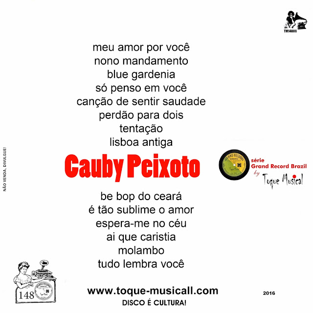 O Grand Record Brazil oferece hoje aos amigos cultos, ocultos e associados a segunda parte do retrospecto especial dedicado ao grande e notável Cauby Peixoto, que partiu para a eternidade em 15 de maio último, deixando muitas saudades em todos aqueles que apreciam o que é bom em matéria de música. Oferecemos aqui mais 14 gravações de Cauby, várias delas prensadas simultaneamente em 78 rpm e vinil. Abrindo esta segunda parte, o bolero “Meu amor por você”, de Lourival Faissal e Edson Menezes, que Cauby gravou na RCA Victor em 20 de dezembro de 1957, com lançamento em abril de 58, sob número 80-1928-B, matriz 13-H2PB-0312. E a faixa seguinte é justamente o lado A, matriz 13-H2PB-0311, e um clássico do repertório dele: o samba-canção “Nono mandamento”, de Renê Bittencourt, retumbante êxito na época, e que o nosso saudoso Cauby também interpretou no filme “De pernas pro ar”, co-produção Herbert Richers-Cinedistri. Na quarta faixa, temos o primeiro hit maiúsculo do “professor da MPB”: o fox “Blue gardenia”, dos norte-americanos Bob Russell e Lester Lee, em versão de Antônio Carlos. Foi composto para o filme de mesmo nome, exibido no Brasil como “Gardênia azul”, e nele interpretado por Nat King Cole, tornando a música bem mais lembrada do que a própria película. O registro de Cauby saiu pela Columbia em maio de 1954, sob número CB-10042-A, matriz CBO-215, e, mais tarde, “Blue gardenia” seria faixa-título e de abertura do primeiro LP do cantor, em dez polegadas. Ainda em 54, apareceu outra gravação em português deste fox, por Lúcio Alves, mas o sucesso foi mesmo de Cauby. Aqui também apresentamos o lado B desse 78, matriz CBO-214: o samba-canção “Só desejo você”, assinado pelo então empresário de Cauby, Di Veras, em parceria com Osmar Campos Filho, e, ainda em 1954, também gravado na Copacabana por Ângela Maria. A música entrou mais tarde no segundo LP de Cauby, o dez polegadas “Canção do rouxinol”. A quinta faixa desta seleção é “Canção de sentir saudade”, samba-canção de Durval Ferreira e Orlando Henriques, que Cauby gravou na RCA Victor em 11 de outubro de 1960, com lançamento em janeiro de 61, sob número 80-2286-A, matriz L2CAB-1132. Mais tarde, seria faixa de encerramento do compacto duplo de 45 rpm número 583-5068. O lado B do 78, matriz L2CAB-1133, que também abriu o compacto em questão e um LP do cantor com o mesmo título, é a faixa seguinte: a balada “Perdão para dois”, de Palmeira e Alfredo Corleto, lançada pouco antes por Leila Silva na Chantecler. Em seguida, temos o beguine “Tentação”, de Edson Borges e Sidney Morais (que integrou o Conjunto Farroupilha e Os Três Morais, e gravou discos de música latina como Santo Morales). Foi lançado pela Columbia, na voz de Cauby, em abril de 1956, sob número CB-10250-B, matriz CBO-727. Logo depois, vem o lado B, matriz CBO-729, o fado “Lisboa antiga”, standard do cancioneiro lusitano, de autoria de Raul Portela, Amadeu do Vale e José Galhardo. Em LP, e de dez polegadas, esta faixa só apareceu na coletânea mista “Meus favoritos – vol. 5”. A faixa 9, “Bibape do Ceará”, é um baião de Catulo de Paula e Carlos Galindo, originalmente gravado pelo próprio Catulo em 1955. O registro de Cauby foi lançado em setembro de 56 pela Columbia, sob número CB-10285-B, matriz CBO-818 (o lado A é o clássico “Conceição”, já oferecido a vocês em nosso volume anterior). Na décima faixa, temos o fox “É tão sublime o amor (Love is a many splendored thing)”, dos norte-americanos Paul Francis e Sammy Fain, em versão de Alberto Almeida. A música deu título a um filme também de sucesso, estrelado por William Holden e Jennifer Jones, e exibido no Brasil como “Suplício de uma saudade”. O registro de Cauby foi lançado pela Columbia em maio-junho de 1956, sob número CB-11002-A, matriz CO-55565, abrindo também seu terceiro LP, o dez polegadas “Você, a música e Cauby”. Em seguida, outro clássico: o bolero “Espera-me no céu (Esperame em el cielo)”, do portorriquenho Francisco López Vidal (Paquito), em versão do pistonista Araken Peixoto, irmão de nosso Cauby, que a imortalizou na RCA Victor em 30 de janeiro de 1957, com lançamento em julho do mesmo ano, sob número 80-1812-B, matriz 13-H2PB-0044. A gravação entrou mais tarde no LP de dez polegadas “Música e romance”, já oferecido a vocês pelo Toque Musical. A faixa seguinte é o lado B do disco de estreia de Cauby, o Carnaval/Star 013, lançado bem em cima do carnaval de 1951, em fevereiro: a marchinha “Ai, que carestia”, de Victor Simon e Liz Monteiro (nada mais atual, não é mesmo?). A penúltima faixa é o clássico “Molambo”, samba-canção do violonista Jayme Florence, o Meira dos regionais, em parceria com Augusto Mesquita. Lançado em 1953 por Julinha Silva, tem vários outros registros, e o de Cauby foi lançado pela Columbia em maio-junho de 1956, em seu terceiro LP, o dez polegadas “Você, a música e Cauby”, chegando ao 78 rpm em agosto seguinte sob número CB-10267-A, matriz CBO-769. E, encerrando esta seleção, o fox “Tudo lembra você (These foolish things/Remind me of you)”. A música foi feita em 1936 pelos britânicos Jack Strachey e Eric Maschwitz (também conhecido por Holt Marvel), mais o norte-americano Harry Link, e tem vários registros. O de Cauby, com letra brasileira de Mário Donato, tem acompanhamento do conjunto do violonista Ângelo Apolônio, o Poly, e saiu pela Todamérica em março de 1953, com o número TA-5259-A, matriz TA-1153. Um fecho realmente de ouro para este retrospecto especial que o GRB dedica ao agora imortal Cauby Peixoto!