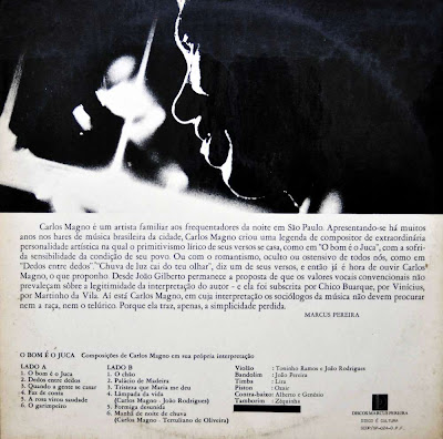 “O bom é o Juca”, creio eu, foi o único lp gravado por esse grande artista. Digo grande artista, não é atoa ou simplesmente pelo excepcional trabalho fonográfico, lançado no início dos anos 70. Carlos Magno, embora só tenha gravado um compacto nos anos 60 pela Philips e este lp pelo Marcus Pereira, tem em seu currículo como compositor dezenas de outras belas canções. Suas músicas já foram gravadas por artistas como Benito Di Paula, Originais do Samba, Elza Soares, Jair Rodrigues e Noite Ilustrada. Este último, inclusive, foi quem lhe abriu as portas na noite paulista. Carlos Magno, por muito tempo, se apresentou em casas noturnas de Sampa, sendo um músico até bem conhecido. Não foi por acaso que Marcus Pereira o convidou para gravar em seu Jogral.