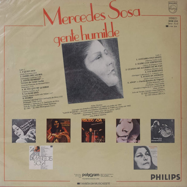 E eis que o TM oferece hoje a seus amigos cultos, ocultos e associados, dentro de seu ciclo dedicado à música folclórica e popular latino-americana, uma compilação daquela que, sem dúvida, foi um dos maiores ícones do gênero, “a voz dos sem voz”, e uma das expoentes do movimento “Nueva canción”. Estamos falando de Haydée Mercedes Sosa, que recebeu de seus fãs o apelido de “La Negra”, por sua ascendência ameríndia, e não por causa dos longos cabelos negros, como se erroneamente acreditava). Mercedes veio ao mundo na cidade de San Miguel de Tucuman, no noroeste da Argentina, em 9 de julho de 1935 (nessa data, curiosamente, em 1816, e na mesma cidade, foi assinada a declaração de Independência da Argentina). Sempre foi patriota, e também árdua defensora do Pan-americanismo e da integração dos povos latino-americanos. Criada durante o governo de Juan Domingo Peron, Mercedes cresceu embalada pela ideologia peronista, recebendo, como quase todos de sua geração, uma influência muito grande da mitológica Evita. Sua ascendência era mestiça (mistura de europeus com americanos e índios): francesa e dos indígenas do grupo diaguita. Sua carreira artística iniciou-se em 1950, quando venceu, na plenitude de seus quinze anos, um concurso de canto promovido pela rádio de sua cidade natal, ganhando um contrato de dois meses com a emissora. Em 1962 é lançado seu primeiro álbum, “La voz de la zafra”, gravado no ano anterior. Em seguida, ficou conhecida entre os povos indígenas argentinos ao fazer uma performance no Festival Folclórico Nacional. Sua preocupação sócio-política refletia-se no repertório que interpretava, tendo sido uma das maiores expoentes do movimento “Nueva canción”, movimento musical com raízes africanas, cubanas, andinas e espanholas, marcado por uma ideologia de rechaço ao imperialismo norte-americano, ao consumismo e às desigualdades sociais. Além do sucesso na Argentina, apresentou-se também em países da América e da Europa. A temática social e ligação com a esquerda também lhe renderam dissabores. Em 1979, em La Plata, durante a ditadura argentina, por exemplo, um show da artista foi invadido pelos militares, e tanto ela quanto o público presente foi parar na prisão! Banida no próprio país, Mercedes decidiu se exilar, primeiro em Paris, depois em Madri. Voltou à Argentina em 1982, vários meses antes do colapso da ditadura militar argentina, resultado da fracassada Guerra das Malvinas, e deu uma série de shows no Teatro Cólon, em Buenos Aires, onde convidou muitos colegas jovens para cantar com ela (um LP duplo com gravações dessas performances logo fez sucesso). E continuou a se apresentar nos anos seguintes, não só na Argentina, como também no exterior, cantando em lugares como o Lincoln Center, o Carnegie Hall e o Teatro Mogador. Entre os artistas que gravaram com ela estão Fito Páez, Mílton Nascimento, Léon Gieco, Daniela Mercury, Beth Carvalho, Chico Buarque, Fagner, Sting, Andrea Bocelli e até mesmo a colombiana Shakira. Tem mais de 50 álbuns em sua discografia, e foi considerada a melhor intérprete das composições do argentino Atahualpa Yupanqui e da chilena Violeta Parra. Ganhou quatro vezes o Grammy Latino de melhor álbum de música folclórica (em 2000, por “Misa Criolla”, em 2003 por “Acústico”, em 2006 por “Corazón libre” e já postumamente, em 2009, por “Cantora 1”). E continuaria em atividade até falecer, em 4 de outubro de 2009, aos 74 anos, de problemas renais. Hoje, o TM oferece a vocês uma coletânea com algumas das melhores gravações da notável e imortal Mercedes Sosa, lançada pela Philips argentina dentro de uma série denominada “Grandes artistas”, e reunindo gravações feitas entre 1966 e 1972 (talvez o disco seja de 1975). São treze faixas em que ela nos apresenta um repertório de primeira linha, de renomados compositores populares latinos, como Atahualpa Yupanqui (“Duerme mi negrito”, tema folclórico recolhido por ele), Armando Tejada Gomez (“Canción com todos”), H. Rufo Herrera (“Zamba del chaguanco’), Ariel Ramirez (que também a acompanha ao piano em “Alfonsina y el mar”), Figueredo Iramain (‘Cancion del derrume índio”) e Violeta Parra (“Gracias a la vida”, clássico que mereceu interpretação inesquecível de Mercedes). Tudo isso mostrando a força e o talento desta inesquecível intérprete, com todos os atributos que a fizeram, com justiça, uma gigante da música latino-americana contemporânea. E atenção: brevemente, estaremos postando mais álbuns de Mercedes Sosa. Aguardem!