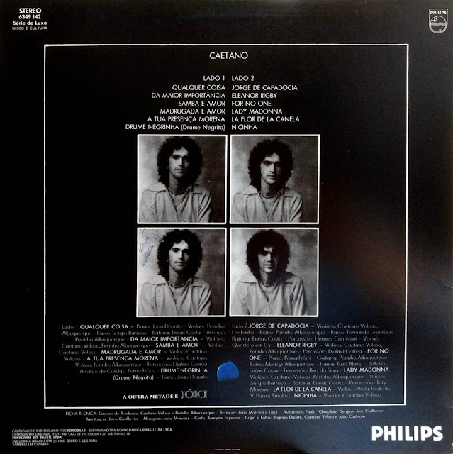 Mas a razão que leva uma coisa a outra é eu ter à mão algo interessante, curioso ou raro que coincidentemente justifique um postagem. Não quero e nem posso ficar nesse esquema de postar homenagens. No caso do Caetano Veloso temos o polêmico álbum “Jóia”, lançado em 1975 pela Philips. Após o lançamento, não demorou muito para que a censura cortasse o barato do disco, a fotografia na contracapa onde Caetano, Dedé e Moreno aparecem nús. Acredito que por essa razão Caetano, chateado, resolveu também mudar o seu desenho na capa, deixou apenas os passarinhos. Só tempos depois, na edição em cd é que a capa voltou com a arte original, mas sem a foto. Por essa razão o álbum tornou-se um objeto de procura por muitos colecionadores.