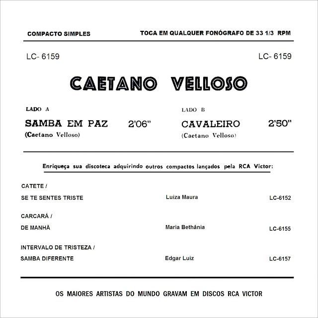 Boa noite, amigos cultos e ocultos! Seguimos hoje com esse compacto nota 10, um disquinho especial, o primeiro registro do genial Caetano Veloso, aqui ainda com dois Ls. Certamente, trata-se de um disquinho já bem divulgado e hoje, mais ainda, na rede é que nem bolacha, em qualquer canto se acha. Mas isso só no formato digital, pois o compacto em si é hoje moeda forte. Tem maluco tentando vender o seu no Mercado Livre por quase 200 pratas. Mas Mercado Livre não deve servir de referencia para preço, ainda mais de vinil que até poucos anos atrás eram vendidos quase de graça. Hoje, com muita informação e fake news, dourar a pílula ficou mais fácil. E o que não falta é trouxa para comprar a joia. Aqui, o que importa é ter em nosso acervo digital um disco que é a cara do Toque Musical (putz, até rimou!) Deixo aqui também a minha gratidão a mais um bom amigo do TM, o Denys, que muito me ajudou no tratamento da capinha e selo. Valeu, brother! 🙂