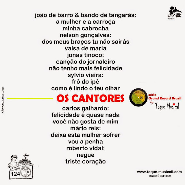 Para começar, apresentamos Carlos Alberto Ferreira Braga, o João de Barro, também conhecido por Braguinha (Rio de Janeiro, 29/3/1907-idem, 24/12/2006), compositor de inúmeros e expressivos sucessos no carnaval e no meio-de-ano. Nesta edição de GRB, apresentamos duas gravações que ele fez como intérprete, à frente do Bando de Tangarás, na Parlophon, ambas do disco 13173, lançado em junho de 1930. Começamos com o lado B, matriz 3539, uma toada de autoria dele próprio, “A mulher e a carroça”. Depois temos o lado A, matriz 3538, por certo o que mais apareceu. Trata-se do samba “Minha cabrocha”, de autoria de Lamartine Babo, então definindo seu estilo. Este, aliás, foi o primeiro grande sucesso autoral de Lalá, e, embora samba de meio-de-ano, também alcançaria êxito no carnaval de 1931. “Minha cabrocha” é conhecido até hoje e tem várias regravações. Nélson Gonçalves (Santana do Livramento, RS, 21/6/1919-Rio de Janeiro, 18/4/1998), o sempre querido e lembrado “metralha do gogó de ouro”, cujos álbuns têm sido presença cativa no Toque Musical, está presente nesta edição do GRB com outras duas faixas, que gravou na Victor em princípio de carreira. A primeira é o clássico fox-canção “Dos meus braços tu não sairás”, de autoria de Roberto Roberti. Nélson o imortalizou na marca do cachorrinho Nipper em 27 de abril de 1944,com lançamento em junho do mesmo ano, disco 80-0186-A, matriz S-052950. Depois temos “A valsa de Maria”, de Custódio Mesquita e David Nasser, gravada em 28 de janeiro de 1943 e lançada em abril do mesmo ano, disco 80-0066-A, matriz S-052706. Em ambas as faixas, o acompanhamento é da orquestra do próprio Custódio Mesquita. Temos, em seguida, as músicas do único 78 rpm de Jonas Corrêa Tinoco (Niterói, RJ, 14/9/1918-Rio de Janeiro, 1/12/1986), o Victor 33639, gravado em 13 de julho de 1932 e lançado somente em abril de 33, quando ele tinha 15 anos incompletos. O lado A, matriz 65543, sem dúvida foi o que se tornou mais conhecido: a “Canção do jornaleiro”, de autoria de Heitor dos Prazeres, que popularizou Jonas de imediato e motivou a realização de uma campanha de amparo aos pequenos jornaleiros. Êxito permanente, teve regravações por Franquito, Enéas Fontana e até mesmo por Wanderley Cardoso, um dos futuros astros da Jovem Guarda. No lado B, matriz 65544, Jonas gravou outra pungentíssima canção, “Não tenho mais felicidade”, composta pelo mesmo autor de “Cidade maravilhosa” e “Alô, alô”, André Filho. Entretanto, Jonas Tinoco abandonou de repente sua carreira, que começara bastante promissora, por motivos até hoje desconhecidos. Sylvio Vieira (Jacareí, SP, 28/5/1899-Petrópolis,RJ, 7/2/1970) tinha origem nobre: era Baronete da Pedra Negra. Estudou canto lírico e sua estreia profissional se deu em 23 de abril de 1920, no Teatro São José de São Paulo, interpretando o papel de Valentim na ópera “Fausto”, de Gounod. Atuou em companhias populares e em revistas, nos principais teatros da então capital da República, o Rio de Janeiro (João Caetano, Glória. Cassino, Recreio). Em 23 de novembro de 1935, fez parte da primeira apresentação completa, em português, da ópera “O guarani”, de Carlos Gomes, no Teatro Municipal carioca, sendo figura constante nas temporadas líricas oficiais dessa casa de espetáculos até o início dos anos 1960. Sylvio Vieira comparece nesta edição do GRB com as músicas do disco Victor 33558, gravado em 29 de abril de 1932 e lançado em junho do mesmo ano. O lado A, matriz 65477, apresenta o maior sucesso do cantor na área da música popular: a canção “Frô do ipê”, de autoria do pistonista Bomfiglio de Oliveira, em parceria com Nélson de Abreu. No lado B, matriz 65478, ele nos apresenta outra canção, esta de André Filho, “Como é lindo o teu olhar”. Carlos Galhardo, o eterno “cantor que dispensa adjetivos”, é aqui apresentado em dois momentos distintos de sua vitoriosa carreira. De início, ele interpreta aqui “Felicidade… é quase nada”, de Joubert de Carvalho e Gilberto de Andrade, em ritmo de samba-canção (no original era rumba). Seu criador, nos palcos e no disco, foi Roberto Vilmar, em 1933.A regravação de Galhardo foi feita na RCA Victor em 24 de maio de 1950, com lançamento em agosto do mesmo ano, disco 80-0674-B, matriz S-092682. Pulamos em seguida para o início da carreira de Galhardo, apresentando a faixa de abertura de seu primeiro disco, o Victor 33625, gravado em 5 de janeiro de 1933 e lançado em março do mesmo ano, matriz 65658: é o frevo-canção (então chamado de “marcha pernambucana”) “Você não gosta de mim”, de autoria dos irmãos Raul e João Victor Valença. Carlos Galhardo,por sinal, seria o cantor do Sul mais fiel ao frevo, lançando músicas do gênero em vários carnavais, sempre com sucesso certo no Recife e, por tabela, em todo o Nordeste. Autêntico precursor da bossa nova, Mário Reis (Rio de Janeiro, 31/12/1907-idem, 5/10/1981) aqui interpreta dois sambas do mestre de Ubá, Ary Barroso, por sinal seu colega de Faculdade de Direito. Primeiro, “Deixa esta mulher sofrer”, gravação Columbia de 13 de outubro de 1939, lançada em dezembro do mesmo ano, disco 55189-A, matriz 218. A faixa seguinte vem a ser a primeira composição gravada de Ary, “Vou à Penha”, aludindo a uma festa que acontece no Rio de Janeiro entre os meses de outubro e novembro, no caminho de subida para a Igreja da Penha, ao lado do Parque Shangai, com barraquinhas, venda de artigos religiosos, alimentação típica, etc. O samba saiu no quarto disco de Mário Reis, o Odeon 10298-A, em dezembro de 1928, matriz 2078, e teria uma continuação trinta anos mais tarde, composta pelo próprio Ary, “Eu fui de novo à Penha”, gravada por Lucienne Franco. Por fim, apresentamos Roberto Vidal, cantor que teve sua época, mas foi esquecido com o passar do tempo. Aqui temos as faixas do disc