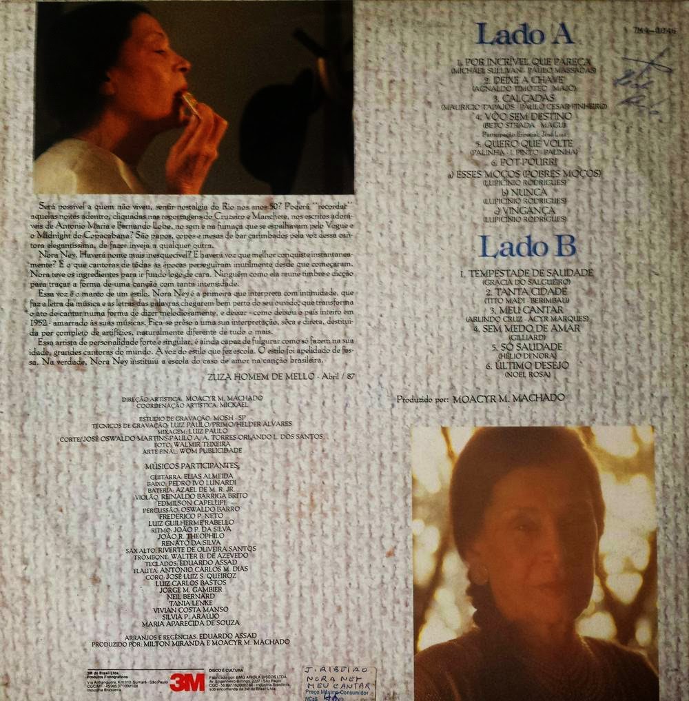 Temos assim a cantora Nora Ney neste álbum lançado em 1955, seu primeiro lp. Sem dúvida um belo disco, a começar pela capa, uma jóia de arte. Dentro temos oito sambas para alimentar qualquer dor de cotovelo. Quatro dessas músicas são de Antonio Maria, sendo uma delas em parceria com Vinicius de Moraes. Outro destaque é o samba canção “O que vai ser de mim” de Antonio Carlos Jobim. Nora foi a primeira artista a gravar uma música de Tom.