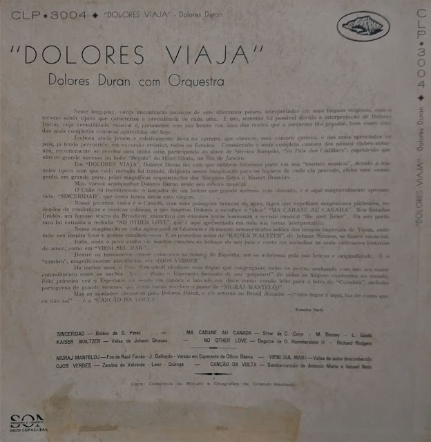 O toque de hoje é com a cantora e compositora Dolores Duran, um nome já bem divulgado por aqui, inclusive, boa parte deste repertório volta a se repetir. Mesmo assim, eu achei por bem de postar o álbum original com capa da época. Este disco, óbvio, já foi relançado outras vezes, creio inclusive que já tenha saído também em cd (mas quem é que está procurando cd por aqui?). Certo é que “Dolores Duran Canta Para Você Dançar” é um disco ótimo. Conforme se pode ler no texto da contracapa, este foi o terceiro álbum de Dolores lançado pelo selo Copacabana, em 1957. “Canta Para Dançar Com Você” teria no ano seguinte um segundo volume (logo que der eu posto aqui para vocês). Creio que não seja necessário entrar em detalhes sobre o conteúdo musical deste lp, na contracapa, como vocês verão há uma descrição de cada uma das faixas. Pessoalmente, neste disco, o que mais me agrada são as músicas de Billy Blanco, que no álbum formam quatro. Não posso esquecer também da cereja do bolo, a faixa “Por causa de você”, de Dolores e Antonio Carlos Jobim. A cantora neste lp vem acompanhada por Severino Filho e seu conjunto. É dele também todos os arranjos. Um belo disco, independente qualquer coisa, essencial nas fileiras do Toque Musical 😉