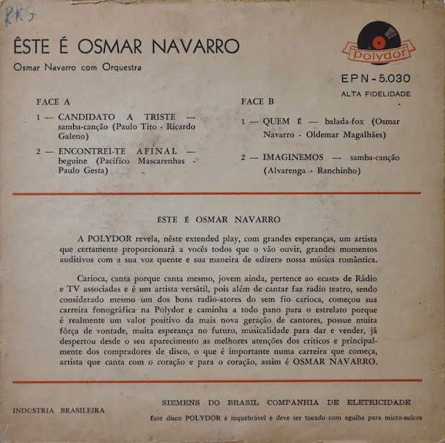 Dando sequência as nossas postagens eu trago hoje este raro compacto duplo do cantor e compositor Osmar Navarro. Este foi o primeiro disco em 33 rpm gravado pelo artista. Na verdade, este compacto reúne as quatro primeiras músicas gravadas por ele no final dos anos 50, ainda na versão 78 rpm. Neste disquinho, lançado em 1960, um dos primeiros compactos fabricados no Brasil, Navarro nos apresenta quatro sucessos, sendo “Quem é”, a canção mais expressiva e que veio a ser seu ‘carro chefe’. Curioso, existe muita gente que acha que quem canta essa música é o Agostinho dos Santos. Tem a ver com o timbre da voz, certamente…