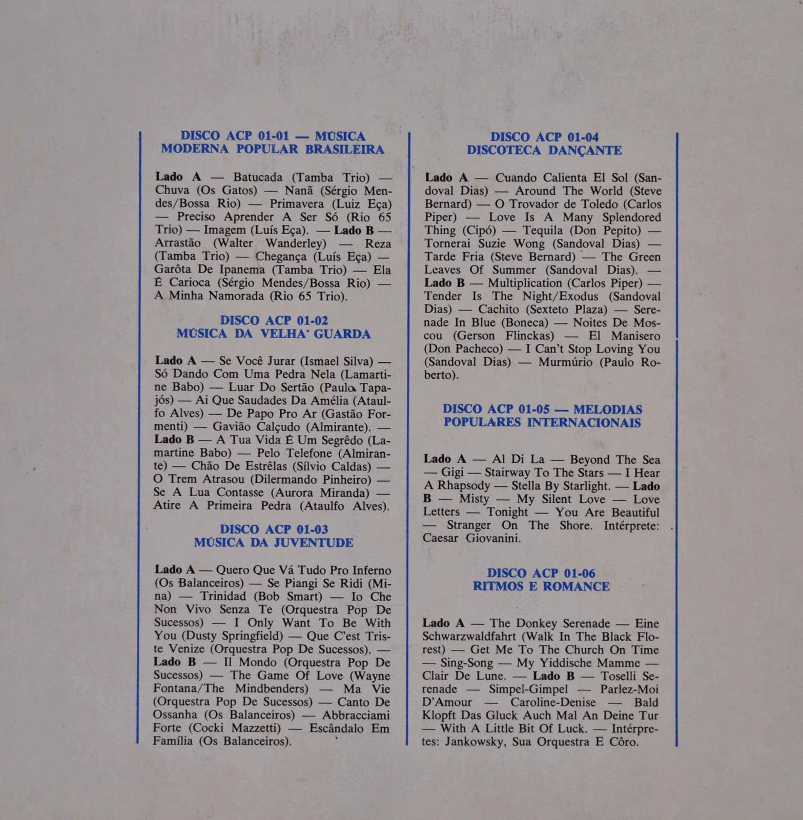 Olá amigos cultos e ocultos! Cumprindo aqui o prometido, segue hoje mais um disco da caixa “Ritmos e Melodias na Música Popular. Este é o disco 4. O 3, 5 e 6 eu não irei postar porque são temas e artistas internacionais, que de uma certa forma não nos interessa, pelo menos não aqui no Toque Musical. O lp “Discoteca Dançante” é sem dúvida um dos discos mais interessantes da caixa, trazendo um repertório de sucessos internacionais variados, assim como são variados os interpretes e orquestras. Alguns inclusive inéditos em nossas listas.