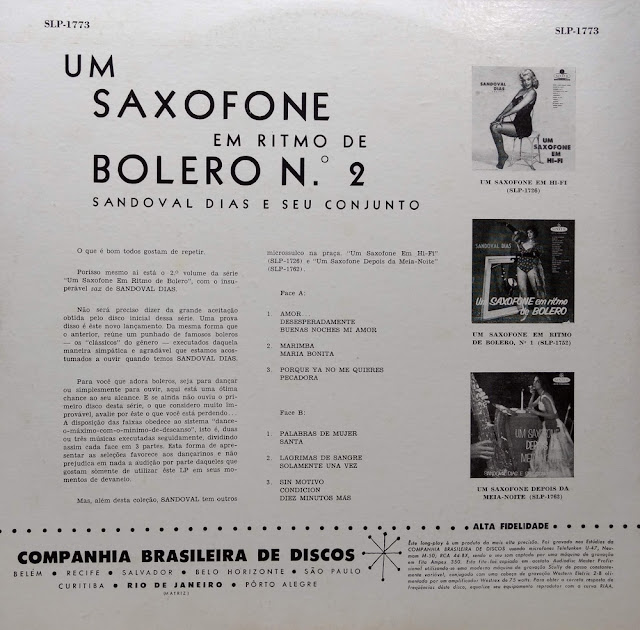 Ritmo de origem cubana, mesclando raízes espanholas com influências locais de vários países hispano-americanos, o bolero sempre foi muito popular, inclusive no Brasil. Influenciou o samba-canção, o mambo, o chá-chá-chá e a salsa. Existe inclusive uma variante do bolero surgida na República Dominicana, nos anos 1960, a bachata. Entre os mais conhecidos intérpretes de boleros, podemos citar: o chileno Lucho Gatica, o espanhol Gregorio Barrios (que até radicou-se no Brasil), o argentino Roberto Yanés , o cubano Bienvenido Granda (“o bigode que canta”), o mexicano Armando Manzanero, o Trio Los Panchos (formado por mexicanos radicados nos EUA), e os brasileiros Anísio Silva, Orlando Dias e Altemar Dutra, além do Trio Irakitan. Até Maysa gravou boleros, e dizia gostar do gênero, sem se envergonhar disso (com razão, convenhamos). E Sidney Morais, ex-integrante do Conjunto Farroupilha e dos Três Morais, fez sucesso nos anos 80 com a série de álbuns “Boleros con amor”, sob o pseudônimo de Santo Morales. Mais recentemente, iriam destacar-se no gênero o portorriquenho Luís Miguel e as cantoras brasileiras Tânia Alves e Nana Caymmi. O bolero também influenciou, e muito, a música sertaneja brasileira, e até hoje é cultivado por intérpretes desse gênero. Sendo um ritmo musical bastante apreciado até hoje pelos brasileiros, o bolero também dá ibope até em blogs dedicados a raridades discográficas, como o Baú de Long Playing, o Estação Saudade e, claro, o nosso TM. Tanto que já colocamos à disposição de nossos amigos cultos, ocultos e associados, títulos como os das orquestras Românticos de Cuba, Namorados do Caribe, e Serenata Tropical. Pois hoje apresentamos mais um grande álbum do gênero: trata-se do segundo volume de “Um saxofone em ritmo de bolero”, editado em 1959 pela Sinter, hoje Universal Music. E novamente trazendo o expressivo e talentosíssimo Sandoval Dias (1906-1993), agora pondo seu sax de ouro a serviço de alguns dos melhores e mais expressivos boleros de todos os tempos. Como frisado na contracapa, a disposição das faixas segue o esquema “dance o máximo com o mínimo de descanso”, distribuindo os catorze clássicos do bolero aqui incluídos (como “Santa”, ‘Amor”, “Desesperadamente”, “Palabras de mujer”, “Dize minutos mas”, “Lagrimas de sangre”) em seis faixas, com duas ou três músicas executadas seguidamente. Portanto, este disco é um prato cheio para quem aprecia boleros, seja para dançar ou apenas ouvir. É mais uma joia rara que o TM posta com a satisfação e o orgulho de sempre, e por certo fará os ouvintes recordarem momentos inesquecíveis ao som destes boleros mundialmente consagrados. E aí? Dá-me o prazer desta contradança?