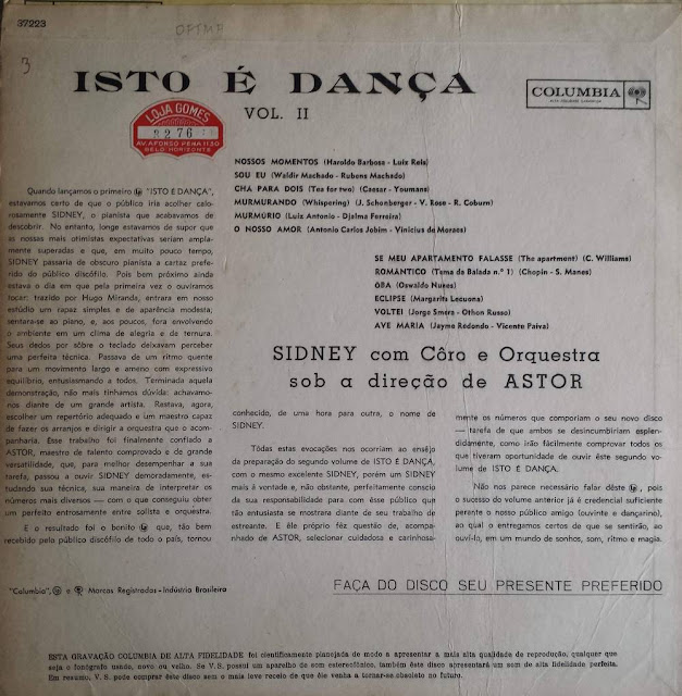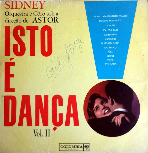 Aqui temos para hoje mais um disco interessante que merece uma conferida. Um álbum feito para as ‘horas dançantes’ do final dos anos 50. Misturando os ritmos e sucessos predominantes na época, este lp lançado pela Columbia, nos traz o obscuro Sidney, um pianista que só se tem notícias através desta série “Isto é dança”. Informações sobre ele só mesmo na contra-capa do disco, numa apresentação rápida que nada acrescenta. Por outro lado, temos o Astor Silva, instrumentista, arranjador e maestro que teve sua vez. Com sua orquestra, gravou diversos discos e acompanhou outros tantos artistas. Foi dele os arranjos e acompanhamento nos primeiros passos fonográficos do rei Roberto Carlos.