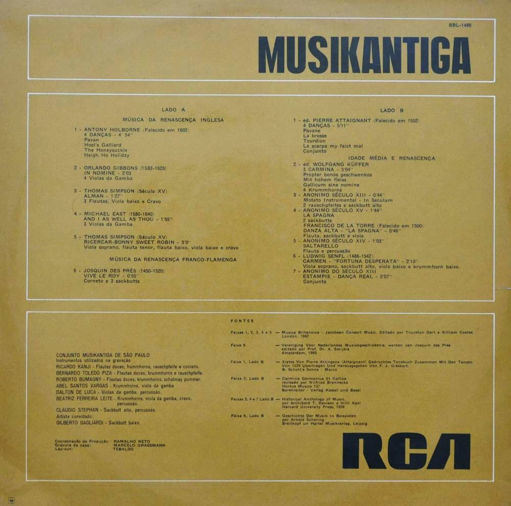 Enquanto isso, vamos em frente. Mantendo as variações musicais, eu trago hoje para vocês um pouco de música antiga. Música da Renascença Inglesa, Franco-Flamenga, Idade Média e Renascença. Mas, afinal, o que está música tem a ver com o Brasil, ou com as postagens do Toque Musical? Ah! Tudo a ver… não apenas pelo fato de que o Toque Musical é eclético, mas também porque se trata de uma produção brasileira. Um trabalho de pesquisa do consagrado Conjunto Musikantiga de São Paulo. Este grupo foi criado em 1966 pelo músico Ricardo Kanji. O Conjunto Musikantiga gravou seu primeiro disco em 67, tendo também como membros fundadores Milton Kanji, Paulo Herculano e Dalton de Luca. Creio que o primeiro disco foi lançado por Marcus Pereira. Gravaram também outros discos pela Copacabana e este da RCA. O trabalho do conjunto foi muito bem recebido pelo público, principalmente no circuito universitário.