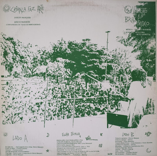Bom dia, amigos cultos e ocultos! Em nosso show de variedades fonográficas eu hoje trago para vocês um trabalho dedicado as crianças. Disco lançado nos anos 80 pela musicista e e arte educadora Doroty Marques, irmã do também músico, Dércio Marques. O álbum, uma produção independente, traz de um lado o registro de um show realizado em praça pública, na cidade de Penápolis (SP), apresentando temas infantins, músicas folclóricas, adaptações e composições de Dércio Marques. No outro lado, temos uma gravação de estúdio. Uma espécie de opereta popular infantil, intitulada “O vaqueiro e o bicho frôxo”, de autoria da própria artista. Um belo trabalho que dificilmente vocês irão encontrar publicado em outro lugar. Aproveitem a ocasião. O tempo não para no porto e os links do TM são por tempo limitado.