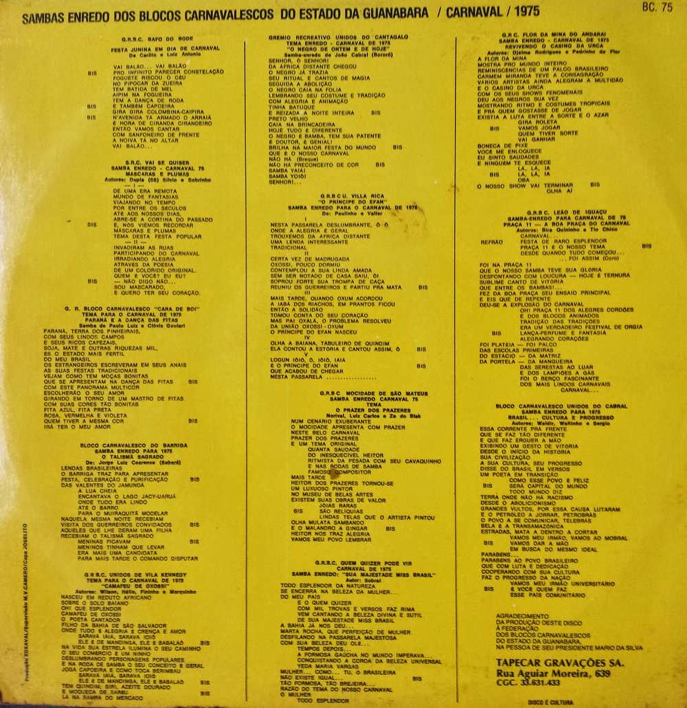 Temos aqui um interessante lp lançado pela Tapecar. Produção da Federação (federação?) dos Blocos Carnavalescos da Guanabara, apresentado os sambas enredos dos blocos carnavalescos do antigo Estado para 1975. Dizem que samba enredo é tudo igual. Talvez em sua essência, assim como o blues americano. Mas há algo de diferente em alguns nessa coisa sempre igual.