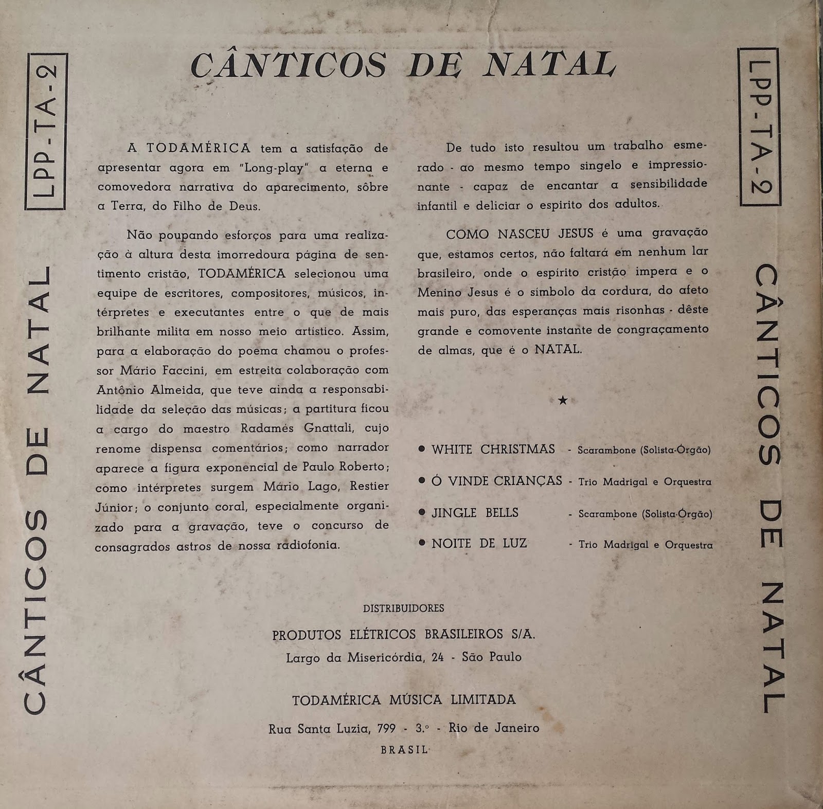 Segue então este disquinho lançado pela Todamérica para o Natal de 1955. Obviamente se trata de um lp de 10 polegadas. “Cânticos de Natal” nos apresenta uma seleção bem montada. Temos de abertura, em todo a face A do disco a história infantil “Como nasceu Jesus”, extraído do poema de Antonio Almeida e Mário Faccini. Conta com a particpação de Mário Lago. O fundo musical é de Radamés Gnattali e o côro composto pelos artistas da gravadora. Na face B do disquinho iremos encontrar quatro temas tradicionais em interpretações de Scarambone e Trio Madrigal.