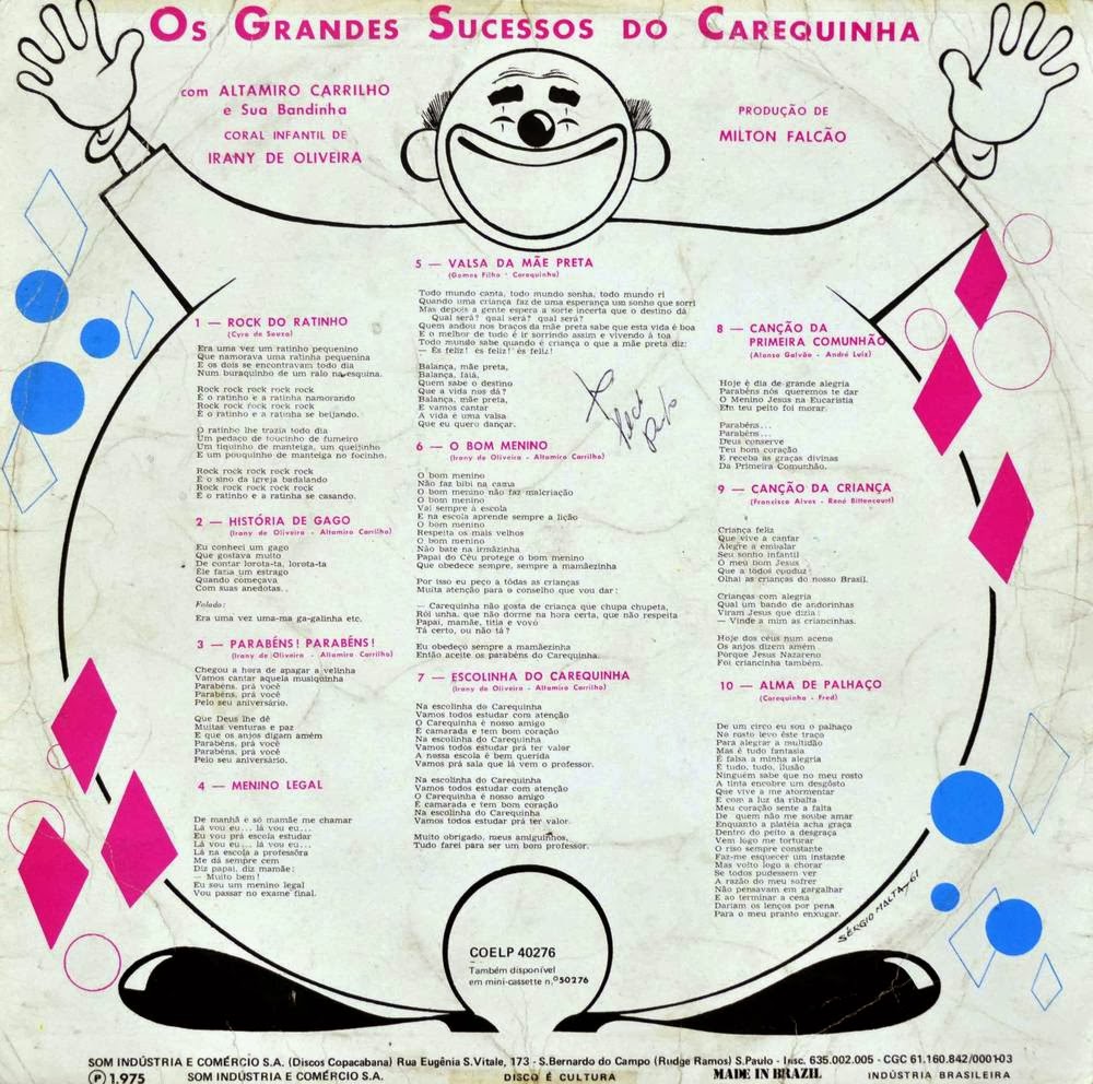 Bom dia, amigos cultos e ocultos! Começamos logo cedo, porque a fila não pára e o tanto de coisa que eu tenho para fazer, talvez não me permita a postagem mais tarde. Trago para hoje o nosso tradicional palhaço Carequinha. Ele já fazia sucesso antes de eu nascer e na minha infância foi figura muito importante e querida. Eu sabia quase todas as músicas que ele cantava. Aliás, quem dessa geração não curtiu o Carequinha, não é mesmo? Segue aqui então este lp, lançado originalmente em 1961 pela Copacabana, reeditado em 1975. Nele, como se pode ver pela capa, encontraremos os seus maiores sucessos fonográficos, as 10 mais do Carequinha :), que vem sempre acompanhado por Altamiro Carrilho e o Coral Infantil de Irany de Oliveira. Sobe a lona, o espetáculo vai começar!
