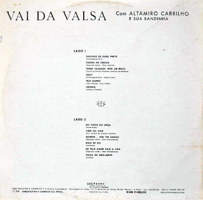 Em homenagem ao Altamiro, deixo aqui este seu disco de valsas, lançado em 1970. Me parece, salvo o engano, que a seleção reúne gravações de 78 rpm, da década de 50. Sem dúvida, um músico como o velho Altamiro Carrilho vai fazer falta. Mas ficará para sempre em nossa memória musical.
