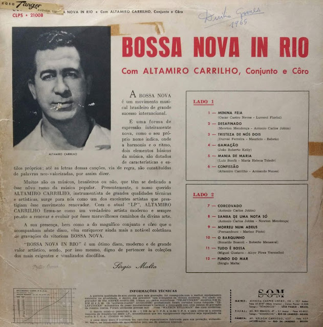 No auge da Bossa Nova ele também deixou em disco a sua interpretação. Gravou em 1963 este belíssimo álbum, “Bossa Nova In Rio”, com seu conjunto e côro, originalmente pelo selo Copacabana. O lp viria a ser relançado novamente, desta vez pelo selo Beverly. Altamiro nos traz um repertório de sucessos, uma síntese do que é a Bossa Nova e em especial no Rio de Janeiro, o berço da coisa. Taí um disco que merece respeito. Confiram no GTM…