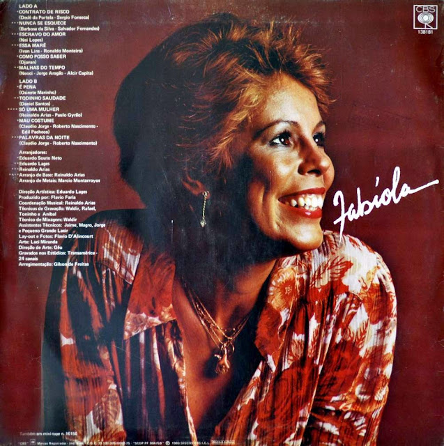 Olá amigos cultos e ocultos! Como a semana começou com cantoras, vamos até o final desta no timbre feminino. Estou trazendo aqui um disco lançado pela CBS no início dos anos 80, apresentando a cantora Fabíola. Confesso que não sei nada a respeito dessa artista, mas mesmo assim achei interessannte postar o seu disco, que traz uma boa produção e um repertório predominante de sambas, todos da melhor qualidade. Valorizando ainda mais as suas qualidades, Fabíola conta também com bons arranjos dos maestros Eduardo Souto Nete, Eduardo Lages e Reinaldo Arias. Márcio Montarroyos também dá uma força como convidado especial e arranjador para os metais. Disquinho bem legal, acima da média. Só nos falta mesmo saber um pouco mais sobre a cantora. Vocês conhecem?