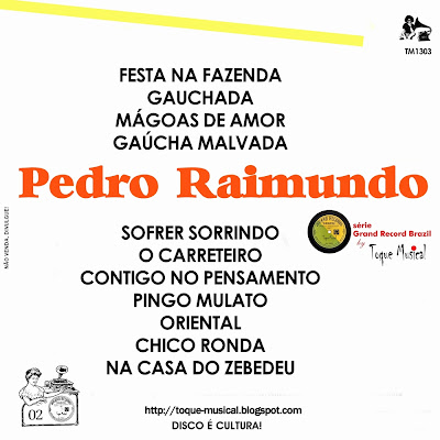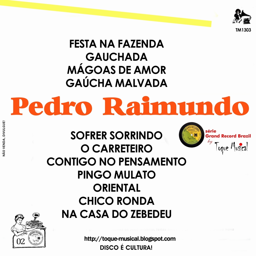 Pois é, amigos cultos e ocultos! Esta décima-terceira edição do Gran Record Brazil vem regada a churrasco e chimarrão! É com muita satisfação que trazemos de volta o inesquecível Pedro Raimundo, “o gaúcho alegre do rádio”. Apesar de ter esse slogan, Pedro Raimundo era catarinense de Imaruí, nascido em 29 de junho de 1906, e falecido no Rio de Janeiro em 9 de julho de 1973. Era filho de um pescador e sanfoneiro, e aos oito anos começou a “afufar o fole”. Mais tarde, lá mesmo em Imaruí, fez parte da banda Amor à Ordem, além de se apresentar em festinhas. Aos 17 anos, Pedro largou o anzol e foi trabalhar na construção da Estrada de Ferro Esplanada-Rio Deserto. Casou-se em 1926, e morou nas cidades catarinenses de Lauro Muller, Blumenau e Laguna, fixando-se, em 1929, na capital gaúcha, Porto Alegre, onde foi condutor de bonde e inspetor de tráfego, e em seus momentos de folga se apresentava nos cafés do Mercado. Em 1939, ingressou na Rádio Farroupilha, onde fundou o Quarteto dos Taúras, atuando em quase todas as rádios portoalegrenses, e sendo muito solicitado para excursões, uma delas, em 1942, pelo interior riograndense. Um ano mais tarde, mudou-se para o Rio de Janeiro, a convite de Almirante, que o levou para a lendária Rádio Nacional. Ainda em 1943, gravou o primeiro disco, na Columbia, mais tarde Continental, com o choro “Tico-tico no terreiro” e o xote “Adeus, Mariana”, hits imediatos. Em suas apresentações, Pedro Raimundo alternava músicas alegres com outras sentimentais, e foi o primeiro artista típico gaúcho a alcançar fama nacional, inclusive com vestimentas típicas (bombachas, lenço no pescoço, botas, esporas, chapéu e guaiaca). Nesta edição do GRB, alguns dos melhores momentos da vitoriosa carreira de Pedro Raimundo, a maior parte em gravações Continental, e mais um disco de sua fase na Todamérica. Em ordem cronológica de lançamento, as músicas são as seguintes, quase todas de sua autoria com ou sem parceiros: do Continental 15127, lançado em abril de 1944, a toada “O carreteiro” (dele com Pirajá), matriz 734, e a valsa “Contigo no pensamento”, matriz 735. Em seguida, o disco 15404, lançado em agosto de 1946, com a toada “Gauchada”, matriz 1176, e o tango “Mágoas de amor”, matriz 1175. No 78 de número 15599, gravado em 12 de setembro de 1945 com acompanhamento do regional de Nélson Miranda e lançado apenas em março de 46, apareceram o xote “Gaúcha malvada” (dele com Mutt), matriz 1278, e a valsa “Sofrer sorrindo”, matriz 1279. Em seguida, o disco 15790, gravado em 30 de maio de 1947 e lançado em junho-julho do mesmo ano, com o chorinho “Chico da Ronda”, matriz 1673, e a polca “Na casa do Zebedeu”, matriz 1672. Ainda na Continental, vem em seguida o disco 16190, lançado em março-abril de 1950, trazendo a polca “Festa na fazenda”, de Pedro Sertanejo, ocupando os dois lados do 78 (matrizes 2265-2266) e com acompanhamento de conjunto. Por fim, do tempo em que Pedro Raimundo estava na Todamérica, o disco TA-5054, gravado em 16 de fevereiro de 1951 e lançado em abril do mesmo ano, com acompanhamento do conjunto do violonista Pereira Filho, trazendo a valsa “Pingo Mulato”, matriz TA-88, e o baião “Oriental”, matriz TA-87. Esta edição do GRB é a prova de que as canções, a sanfona e a alegria de Pedro Raimundo ficarão para sempre em nossa memória. Aproveita, tchê!