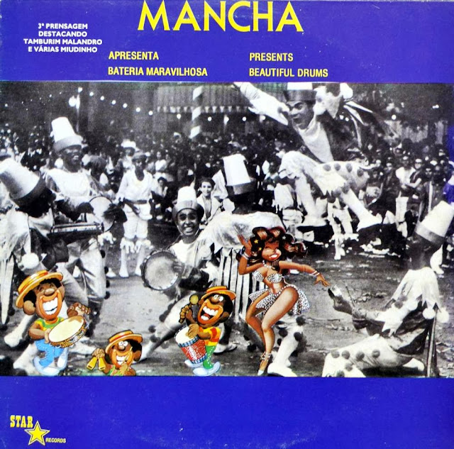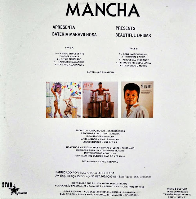 Olá amiguissímos e cultos e ocultos! Batendo o ponto do domingo, aqui vamos nós, antes que o domingo acabe. Estou trazendo para vocês outro curioso e interessante lp que comprei em Sampa. Há tempos este artista me persegue, mas talvez pelo seu visual meio exótico, cabelo armado e bem delineado, lente de contado colorida, corpo brilhante, nunca dei muito crédito. Mas desta vez resolvi encarar o som do Mancha e olha… gostei. Ao que me parece, o cara é daqueles que joga em todas as posições: criação, concepção, produção, execução e divulgação. Seus discos são variados, tem samba, rock, funk… Neste álbum vamos encontra o Mancha nos apresentando a Bateria Maravilhosa. Um disco a la Luciano Perrone, estritamente de percussão. Realmente muito bacana. Fiquei agora interessado em conhecer um pouco mais o trabalho deste artista, Infelizmente, pelo Google não há muito o que encontrar além de anúncios de venda de alguns de seus dsicos. Se alguém tiver informações, por favor, fiquem a vontade para comentar.