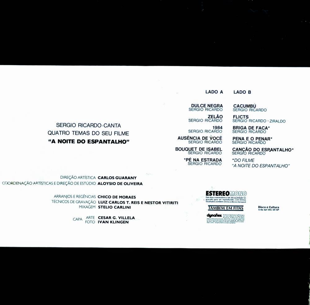 Bom… falando do que é bom, eu hoje estou trazendo aqui para vocês este já bem conhecido, porém sempre bem vindo, álbum do cantor e compositor Sérgio Ricardo. Este lp foi lançado em 1975 pela RCA Victor e traz o artista interpretando, em novas versões, alguns de seus temas para o filme, também de sua autoria, “A Noite do Espantalho”; o clássico “Zelão”; “Dlce Negra”; “Bouquet de Isabel”, “Ausência de você” e também o tema da peça infantil de Maria Clara Machado, “Flicts”, em parceria com Ziraldo.