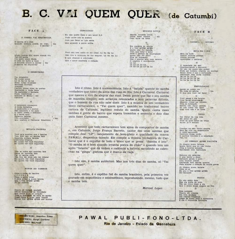 Na onda dos blocos caricatos, aqui vai mais um raro disquinho do selo Pawal: Bloco Caricato Vai Quem Quer, de Catumbi, Rio de Janeiro. Este é mais um daqueles tradicionais blocos carnavalescos carioca, cuja a percussão e repercussão vão além das ruas por onde passam. Até o nome do bloco já serviu de inspiração para outros. Em São Paulo, la na Vila Madalena, também tem um Vai Quem Quer. O de Catumbí surgiu nos anos 50, formado de maneira espontânea na própria comunidade e se mantem vivo e sempre atuante, inclusive no Carnaval deste ano. Este lp, pelas informações que recolhi, foi lançado em 1961. Nos anos 60, discos de carnaval e grupos relacionados a festa eram muito comuns e eram realmente muito bons. eram discos de samba e de batucada autênticos. Infelizmente a coisa toda foi diluindo e o que temos hoje, se comparado aos tempos passados, dá vontade de chorar. Dessa forma, para que o nosso Carnaval não fique com gosto de micareta, pagode e funk, vamos relembrar ou conhecer um verdadeiro bloco caricato. Os sambas apresentados aqui são todos de autoria do carnavalesco Jorge França Barreto.