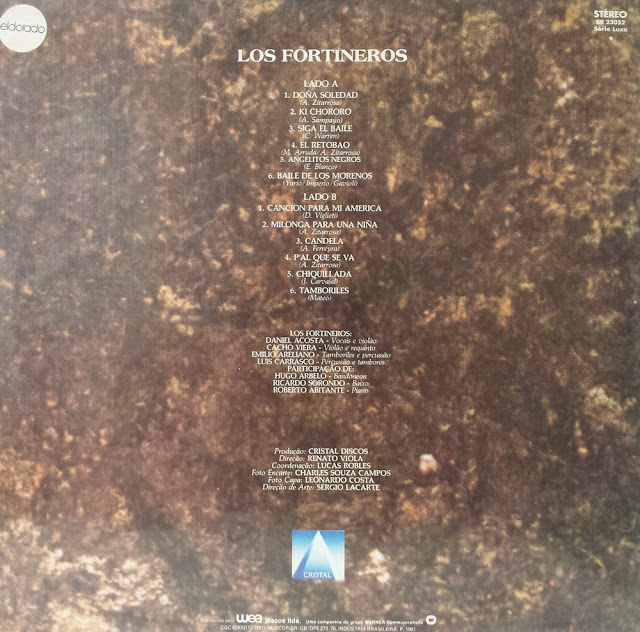 Prosseguindo o ciclo que o TM dedica à música popular e folclórica latino-americana, aqui está, para deleite de nossos amigos cultos, ocultos e associados, um álbum dedicado à musica do Uruguai, que partilha suas origens gaúchas com a Argentina, de forma que o tango tem uma importância relevante no país. É “Canção da América”, gravado no Brasil em 1981 pelo grupo Los Fortineros. É mais um álbum cuja produção foi coordenada por Lucas Robles, que, como vocês já sabem, é argentino radicado em território brazuca. O álbum foi lançado pela gravadora Cristal Discos, ex-Bandeirantes, que já não tinha mais vínculo com a rede de televisão homônima. Na verdade, o Grupo Bandeirantes era sócio do músico Cláudio Petraglia na gravadora, e decidiu vender sua parte. Detalhes à parte, o disco é um apanhado interessante, reunindo expressivos trabalhos de compositores uruguaios, tipo Alfredo Zitarrosa (“Doña Soledad”, “El retobao”, “Milonga para uma niña’, “P’al que se va”), Edoardo Mateo (“Tamboriles”), Geronimo Yorio , Carmelo Imperio e Romeo Gavioli (os três assinando o clássico “Baile de los morenos”), Daniel Vigilieti (“Canción para mi América”) e Aníbal Sampayo (“Ki chororo”), com direito até uma obra-prima do venezuelano Eloy Blanco, “Angelitos negros”. Os cinco membros do grupo, apoiados pelo bandoneonista Hugo Abelo, pelo pianista Roberto Abitante e pelo baixista Ricardo Sorondo, mostram extrema competência, fazendo deste trabalho uma peça de colecionador digna de integrar o ciclo latino de nosso TM. A conferir, sem falta…