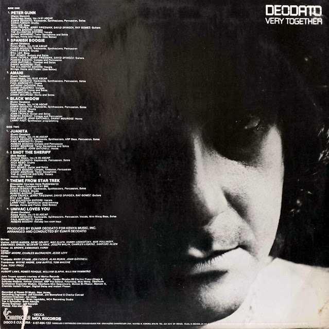 Olá amigos cultos e ocultos! Segue aqui um Eumir Deodato da década de 70, Very Together. Um lp bem pautado no funk, jazz e discomusic. Sempre cercado por uma superprodução, gravações de altíssimo nível e músicos da melhor qualidade. traz um repertório mesclando seus trabalhos autorais e temas famosos como “Peter Gunn”, de Mancini; “I shot the sheriff”, de Bob Marley e também o tema de “Star Trek”. Nesses, Deodato, mestre das releituras, consegue recriar, fugindo totalmente do óbvio. Sem dúvida, um trabalho muito bacana, como muitos outros que ele gravou.