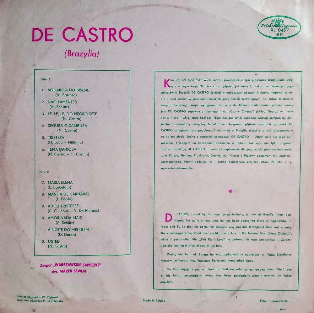 Muito bem, eis aqui a postagem do dia… Trago hoje para vocês mais uma dessas raridades. Aliás, não sei o que é mais, se raro ou curioso. Como se pode ver logo de cara, ou melhor, de capa (e contracapa), temos aqui um disco estrangeiro, vindo lá da Polonia, E claro, acabou caindo na minha mão (eu adoro isso). Temos aqui “Melodias do Brasil”, um inusitado álbum que tem como seu intérprete o sorridente cidadão, De Castro. Mas quem seria esse artista? Nunca tinha visto, nem ouvi falar. No texto de contracapa, escrito em polonês e também em inglês, a informação é superficial e não nos esclarece muito. Conforme o texto, De Castro era Niltinho, cantor da noite, artista com apresentações em casas noutrnas, no rádio, tv e cinema. Também compositor, tendo, segundo o texto, participado com sua música de filmes importantes. Com um currículo como este era para a gente encontrar muita informação através do Google. Mas, qual nada… De Castro, Niltinho, Nilton de Castro… era como procurar agulha no palheiro. Definitivamente, não achei uma pista, apenas suposições. Quem seria este artista? Talvez fizesse parte de algum grupo brasileiro em excursão pela Europa. No texto diz que ele fez uma tournê de sucesso por vários países europeus, o que talvez tenha motivado os polacos a gravarem o rapaz. Mas é ouvindo o disco que a gente consegue imaginar melhor a situação. Pra começar, parece que nessa investida fonográfica, de brasileiro só tinha ele mesmo. Até mesmo os músicos que o acompanham, logo de cara se percebe, não são brasileiros. Aquela batida do samba, aquele jeito de tocar não era coisa daqui. Chega mesmo a ser curiosa algumas interpretações, tais como o samba carnavalesco de Haroldo Lobo e Niltinho, “Tristeza”, ou “Manhã de carnaval”, de Luiz Bonfá. Melhor ainda, no quesito curiosidades, temos também a “Aquarela do Brasil”, de Ary Barroso, ou “A felicidade”, de Tom e Vinícius, aqui chamada de “Adieu tristesse”. O resultado é aquela coisa que a gente já sabe, um quase samba, uma quase bossa. Samba do crioulo branco. Por outro lado, temos também as composições próprias. Quatro das doze faixas são composições do De Castro, músicas essas, por sinal, muito boas. Teriam um melhor sabor se fossem arranjadas e interpretadas por brasileiros. O resultado, num geral é algo que lembra assim um Agostinho dos Santos ao lado da orquestra do Paul Mauriat (só lembra,ok?)