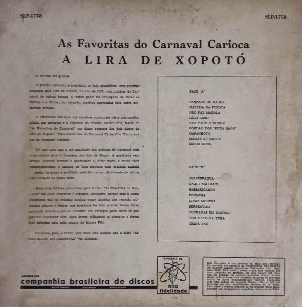 Olá amigos foliões cultos e ocultos! Para não perdermos o pique, aqui vai um clássico. Ou melhor, vários clássicos em um disco clássico da Lyra de Xopotó: “As Favoritas do Carnaval Carioca”. Pelo título já deu para perceber que se trata daquelas músicas de carnaval que ficaram na memória. E isso ainda lá pelos anos de 1957! Sob o comando do Mestre Filó, desfilam em blocos de três, como um pot-pourri, as músicas que ainda hoje embalam muitos carnavais. Vamos então relembrar…