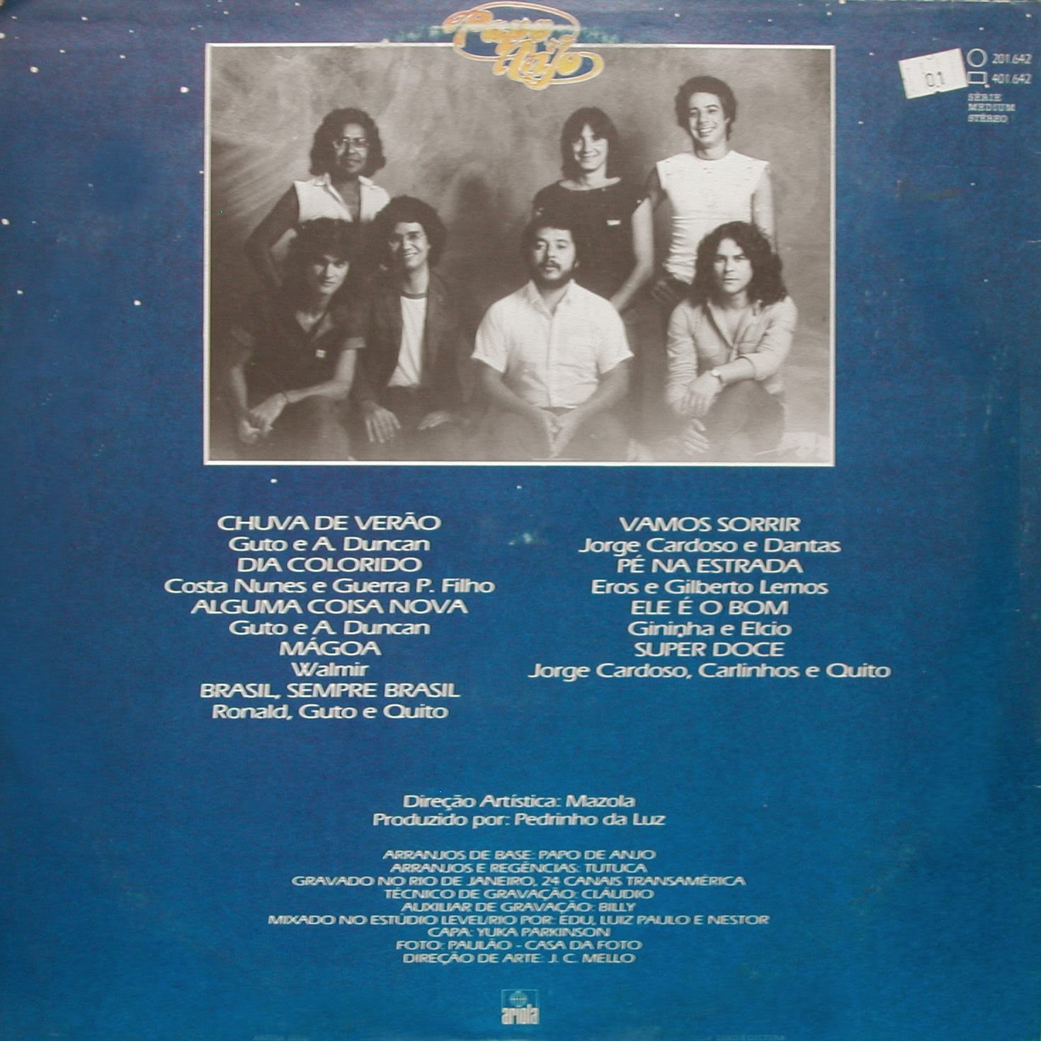 Temos aqui o lp “Vamos sorrir”, do conjunto Papo de Anjo. Disco lançado pelo selo Ariola em 1982. Este grupo, pelo que sei era um conjunto de baile. Conseguiu emplacar uma de suas músicas numa novela da Globo, a faixa “Chuva de verão, que chegou a fazer um relativo sucesso nas rádios. Mas como a música, o Papo de Anjo foi apenas uma chuva de verão. Não sobrou nem sequer uma gota no YouTube, onde eu imaginei que pelo menos essa música alguém teria postado. Qual o que… Não há na rede nenhuma informação sobre o destino do Papo de Anjo. Esse passou batido. Mas vamos dar uma chance aqui no Toque Musical. Confiram…