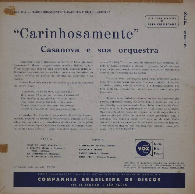 Olá amigos cultos e ocultos! Embalado nos lps de 10 polegadas, encontrei um aqui que inicialmente me deixou um pouco na dúvida. Maestro Casanova… Seria um artista brasileiro? Embora no repertório não conste nenhuma música brasileira, tudo me levou a crer que se tratasse de um maestro famoso, escondido atrás de pseudônimo. Mas, num olhar mais atento, percebo que o selo original é o americano Vox, que nos anos 50 e 60 produziu orquestras e clássicos. Alguns discos deste selo foram lançados no Brasil pela Sinter. Inclusive, deste maestro Casanova, o qual eu pude constatar que foram uns quatro a cinco disco, entre lps de 10 e 12 polegadas. Em apenas um desses álbuns há um rápida referência sobre o tal maestro, dizendo ser ele um europeu. Talvez seja mesmo, pois com certeza não é produção nacional, apenas fizeram o embrulho de presente aqui. Apesar de não ser exatamente um disco brasileiro, ele tem lá as suas semelhanças com o que era produzido e apreciado aqui naqueles anos 50. O repertório traz uma série de ‘standards’ do melhor da música internacional, vejam só…