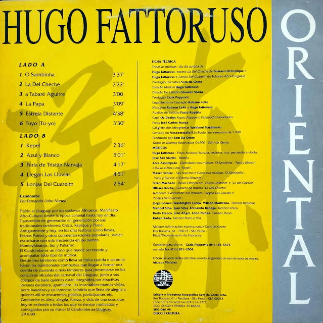 Buenas noches, amigos cultos e ocultos! Para finalizarmos mais um dia de trabalho, que tal um pouco de música instrumental? E nesta oportunidade eu quero trazer aqui um belíssimo trabalho do músico uruguaio, Hugo Fattoruso, um artista cuja a trajetória começa  no rock dos anos 60, quando então fazia parte, ao lado do irmão Osvaldo Fattorusodo, do grupo Los Shakers, um dos primeiros grupos a difundir o rock britânico (Beatles, Stones…) na América do Sul, influenciando também as bandas brasileiras. Hugo, também ao lado do irmão, formou nos anos 70, nos Estados Unidos, o Opa, grupo de jazz rock (fusion) com pitadas latinas, gravando alguns bons discos com participações especiais de brasileiros como Hermeto Pascoal, Airto Moreira e outros, discos raros de se ouvir por aqui. No final dos anos 80 Hugo se mudou para o Brasil onde veio a trabalhar com diversos artistas, entre eles Chico Buarque, Djavan, Naná Vasconcelos, Toninho Horta e Milton Nascimento. Dentro da tendência instrumental ele grava em 1990 para o selo Som da Gente este lp, “Oriental”, com a participações de peso como Zeca Assumpção, Mauro Senise, Sizão Machado, Ulisses Rocha e outros. São onze faixas, todas autorias, inspirada em temas afro-uruguaios. Um belíssimo trabalho que merece ser (re)conhecido. Confiram