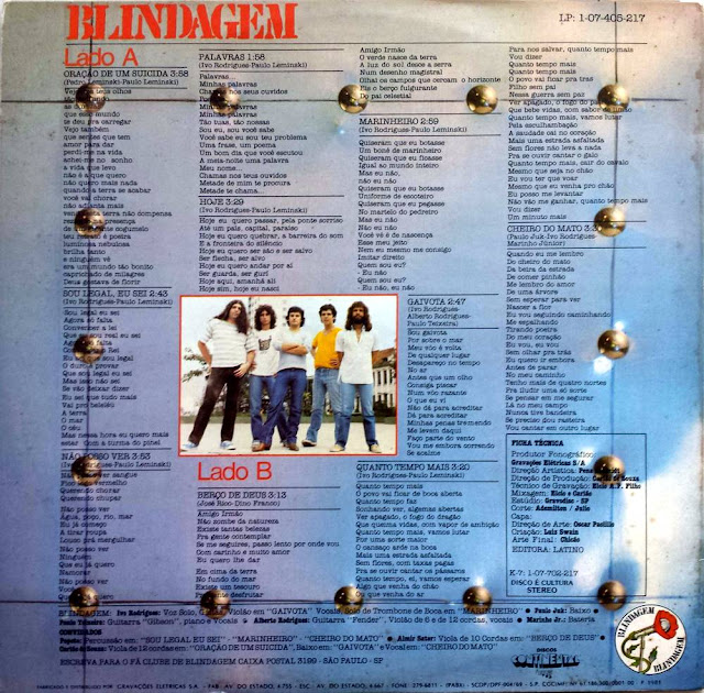 Segue então a banda Blindagem em seu primeiro e mais célebre vôo. A banda foi formada no final dos anos 70 e viria a ser a grande expressão do rock paranaense. Em 1981 eles lançaram pela Continental este disco, com direito a compacto, apresentando as duas músicas de destaque do lp: “Oraçao de um suicida” e “Marinheiro”. O tal disquinho de 7 polegadas era mesmo eficiente, pois foi muito graças a ele que a música do Blindagem ganhou divulgação em rádios, do sul e sudeste do Brasil, dando a banda, logo de início, um certo destaque. O grupo já atuava em festivais e shows nos anos 70, mas passa a ganhar força com a entrada do cantor e compositor Ivo Rodrigues, que tinha como parceiro o poeta Paulo Leminski. Neste lp, boa parte das músicas são assinadas por Ivo Rodrigues e Paulo Leminski. Um trabalho interessante e bem produzido, mas que não se repetiria em outros lançamentos posteriores da banda. O Blindagem seguiu seu caminho apostando mais na cena local. Ao longo dos anos começou a investir em outros estilos, indo do rock ao samba, passando por baladas românticas e sertanejo. Evidentemente, isso acabou levando a banda a uma descaracterização da proposta inicial, gerando uma discografia irregular e talvez por conta disso acabou não alcançando um merecido reconhecimento. Ao que consta, o Blindagem continua na ativa, mas sem seu principal capitão, Ivo Rodrigues que faleceu em 2010. Confiram este que foi o melhor e talvez o único nos primórdios do rock setentista do Paraná.