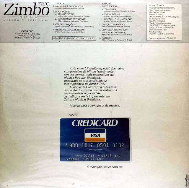 Boa noite, amigos cultos e ocultos! Segue hoje, aqui, mais uma produção para o Inverno & Verão, um restaurante e casa de shows que fez história em São Paulo, na década de 80. Por lá passaram grandes nomes da MPB e desses, muitos dos seus shows foram registrado e posteriormente lançados em discos, em produções independentes, limitadas e não comerciais. Eram discos feitos para serem oferecidos como brindes, como é o caso deste do Zimbo Trio, oferecido como cortesia, em comemoração do terceiro aniversário do deste restaurante.