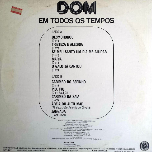 Tenho para hoje um disco que até bem pouco tempo eu não conhecia, exceto por uma ou duas músicas. Trata-se do disco solo de Eustáquio Souza de Faria, ou, mais conhecido como Dom, da dupla Dom & Ravel. Pelo pouco que sei, este foi seu único trabalho, sem o irmão Ravel. O lp foi lançado em 1977, numa fase em que a dupla já havia entrado em declínio. “Em todos os tempos” é um disco onde predomina o samba. Samba? Sim, o cara tinha o ‘dom’ do samba. Mas também tem uns carimbós e fecha com a melhor, a faixa ‘disco’, “Jangada’. Vale a pena conhecer. Em breve teremos a dupla Dom & Ravel aqui, apresentado pelo nosso resenhista Samuca, sempre minucioso, detalhando um pouco mais sobre a carreira dessa curiosa dupla. Aguarde…