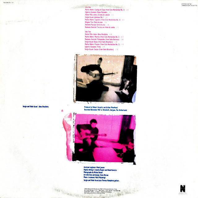 “O melhor duo de violões existente, talvez em toda a história. Nenhuma antecipação poderia ter me preparado para o jeito deles de tocar: flexível, ousado, estranhamente unânime”. Assim escreveu, certa vez, um comentarista do jornal norte-americano “The Washington Post”, referindo-se aos protagonistas da postagem de hoje do TM: o Duo Assad, formado pelos irmãos Sérgio e Odair, cuja família é de origem libanesa. Vindos de escola tradicional do choro, e consagrados internacionalmente, ambos residem no exterior: Sérgio, em São Francisco, EUA, e Odair, em Bruxelas, capital da Bélgica. E têm uma irmã mais nova, também violonista e cantora, mundialmente consagrada, assim como eles, Badi Assad. O pai, relojoeiro de profissão, adorava tocar. Ganhou um cavaquinho em uma rifa e não sabia o que fazer com ele. Aí, comprou discos, ouviu e tirou de ouvido mais de quatrocentos choros! E foi nesse ambiente que os irmãos cresceram e começaram, bem cedo, a dedilhar seus violões. Mais tarde, Sérgio e Odair foram estudar violão clássico com a professora argentina Monina Távora. Além de estabelecer novos padrões de interpretação, os Assad influenciaram vastamente na criação e introdução de novas músicas para dois violões. E essa extraordinária virtuosidade inspirou vários compositores a escrever peças especialmente para os Assad, tais como Astor Piazzolla, Teddy Riley, Radamés Gnattali, Francisco Mignone, Marlos Nobre, Edino Krieger… Além disso, o repertório dos irmãos Assad é formado de arranjos para músicas folclóricas, jazz e música latina, e também de composições próprias. A carreira internacional começou em 1979, em Bratislava, hoje capital da Eslováquia, ao vencerem a Young Artists Competition. E até hoje ambos viajam pelo mundo, apresentando clássicos do violão, não só europeus mas também brasileiros, como as obras de Garoto, Villa-Lobos, Egberto Gismonti, Baden Powell, João Pernambuco e Dilermando Reis. Uma cativante mistura de estilos, períodos e culturas. Os Assad têm trabalhado extensivamente com artistas renomados, tais como Yo-Yo Ma, Paquito D’Rivera, Gidon Kremer, Nadja Salerno Sonnenberg e Dawn Upshaw. Todos os anos, no último final de semana do mês de julho, a cidade de São João da Boa Vista (SP), berço da família, realiza o Festival Assad, que, além de ser referência de música instrumental da mais alta qualidade, recebendo visitantes de várias partes do mundo, já se tornou tradição no calendário cultural do município. E, claro, contando com a participação dos irmãos Assad. Da vasta e extensa discografia de Sérgio e Odair Assad (mais de 30 álbuns), o TM oferece hoje a seus amigos cultos, ocultos e associados, “Alma brasileira”, selo Nonesuch /Warner. Gravado na Holanda, em 1987, e lançado no Brasil dois anos mais tarde, possui um repertório de primeiríssima qualidade, assinado por compositores do porte dos que já citamos aqui: Egberto Gismonti (“Baião malandro”, “Frevo”), Marlos Nobre (“Cantiga de cego”, “Capoeira” “Martelo”, “Praiana”, todas da série “Ciclos nordestinos”), Radamés Gnattali (“Tocata em ritmo de samba”, “Pixinguinha”, esta última da série “Retratos”), além de trabalhos próprios de Sérgio Assad (“Jobiniana número 1”e, da “Suíte brasileira”, “Baião” e “Canção”). Ainda batem ponto aqui Wagner Tiso (“Choro de mãe”) e Hermeto Paschoal (“Série de arco”). Um trabalho absolutamente impecável, que o TM orgulha-se em oferecer, e mostra por que Sérgio e Odair Assad tornaram-se referência unânime para os violonistas, criando um padrão de inovação para o violão com geniosidade e expressão.